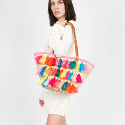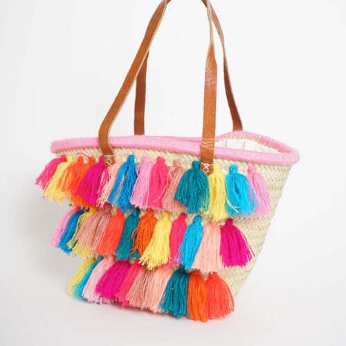 Capazo de Palma Natural con Asas de Piel y Borlas Multicolor Hilo
