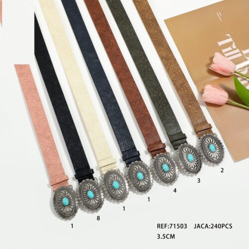 Cinturón Grabado Floral detalle Piedra Celeste Hebilla