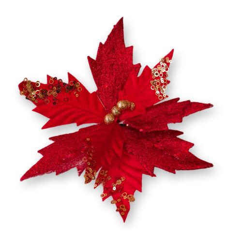 Una Pieza Flor Artificial Navideña Roja con Hojas Aterciopeladas y Brillantes