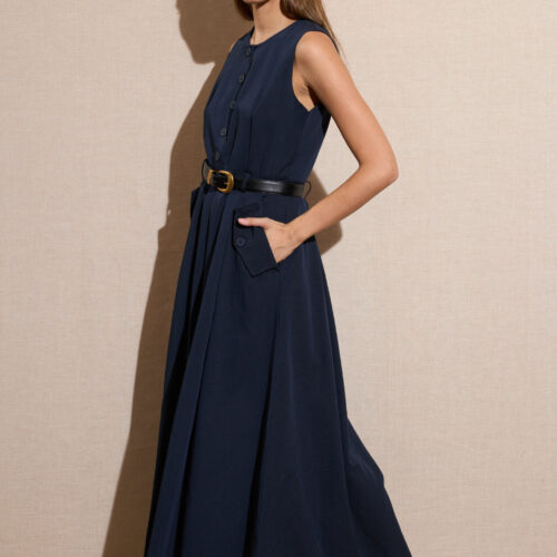 Vestido Largo Azul Marino Botones con Bolsillos Manga Sisa