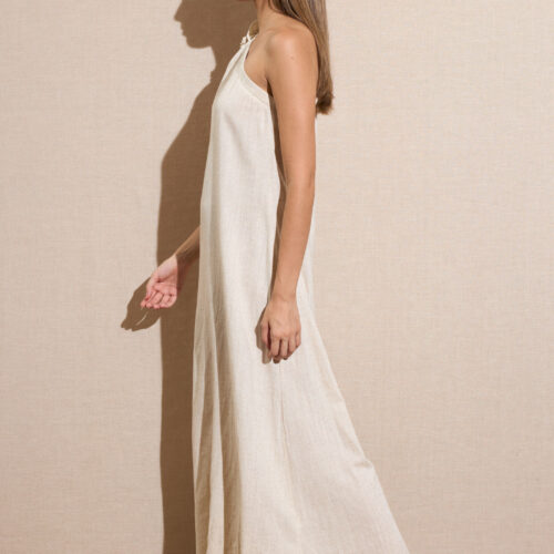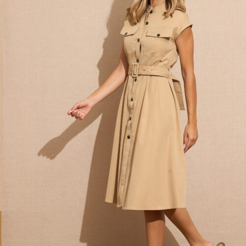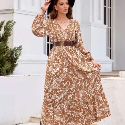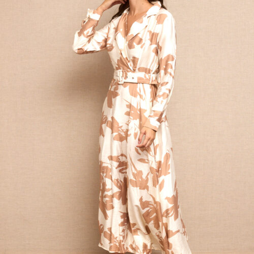 Vestido Beige Estampado Floral Largo Detalle Cinturón