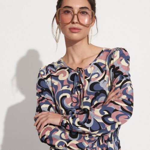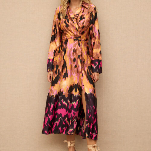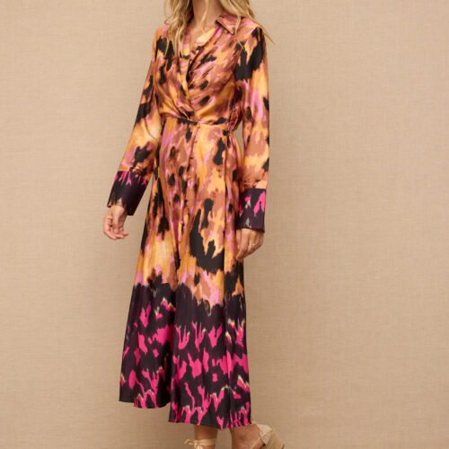 Vestido Camisero Escote Cruzado Largo Estampado Manga Larga Tonos Tierra