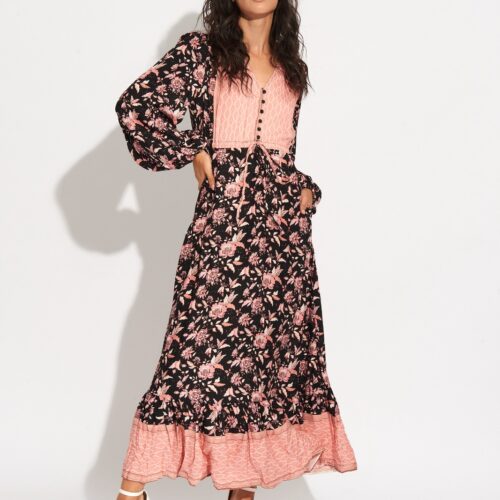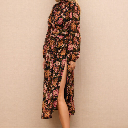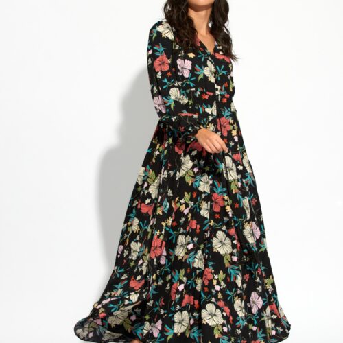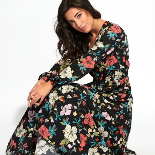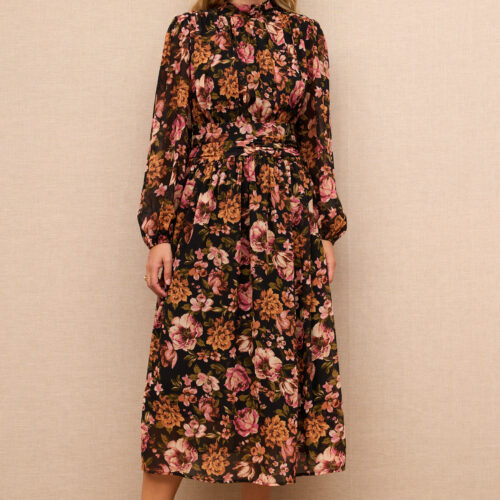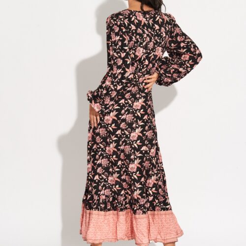 Vestido Negro Largo Estampado de Flores Manga Larga Abullonada