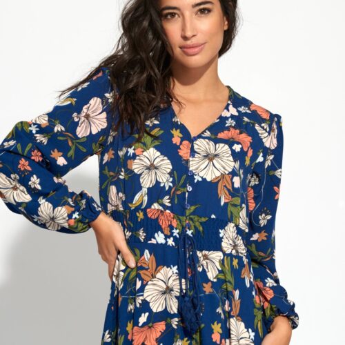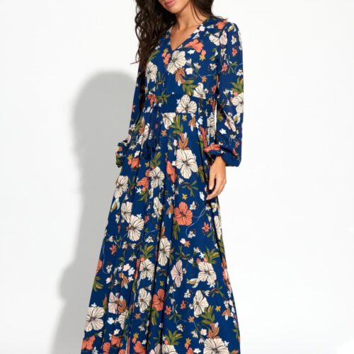 Vestido Largo Azul Oscuro Flores Color Corales y Blancas