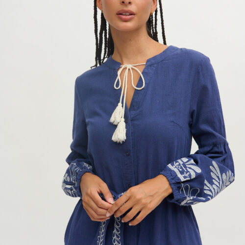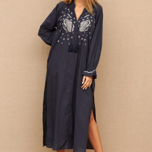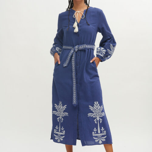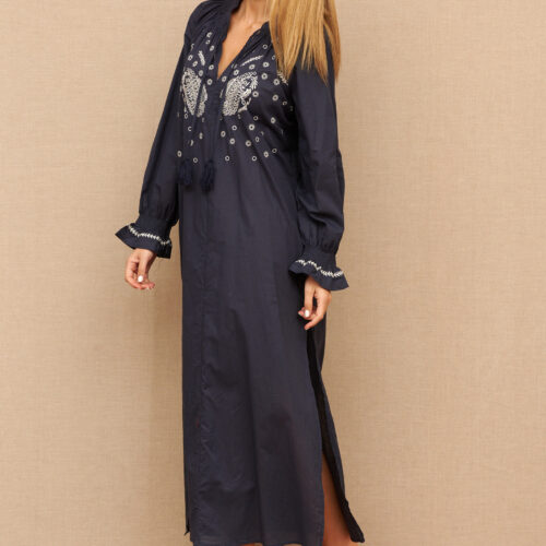 Vestido Largo Azul Marino Con Bordado Floral Blanco