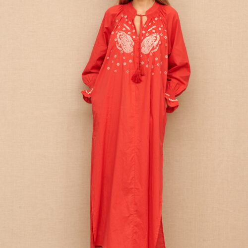 Vestido Largo Rojo Con Bordado Floral Blanco
