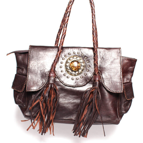 Bolso de Piel Marruecos Interior Bolsillo Cremallera con Borlas Detalle Piedra