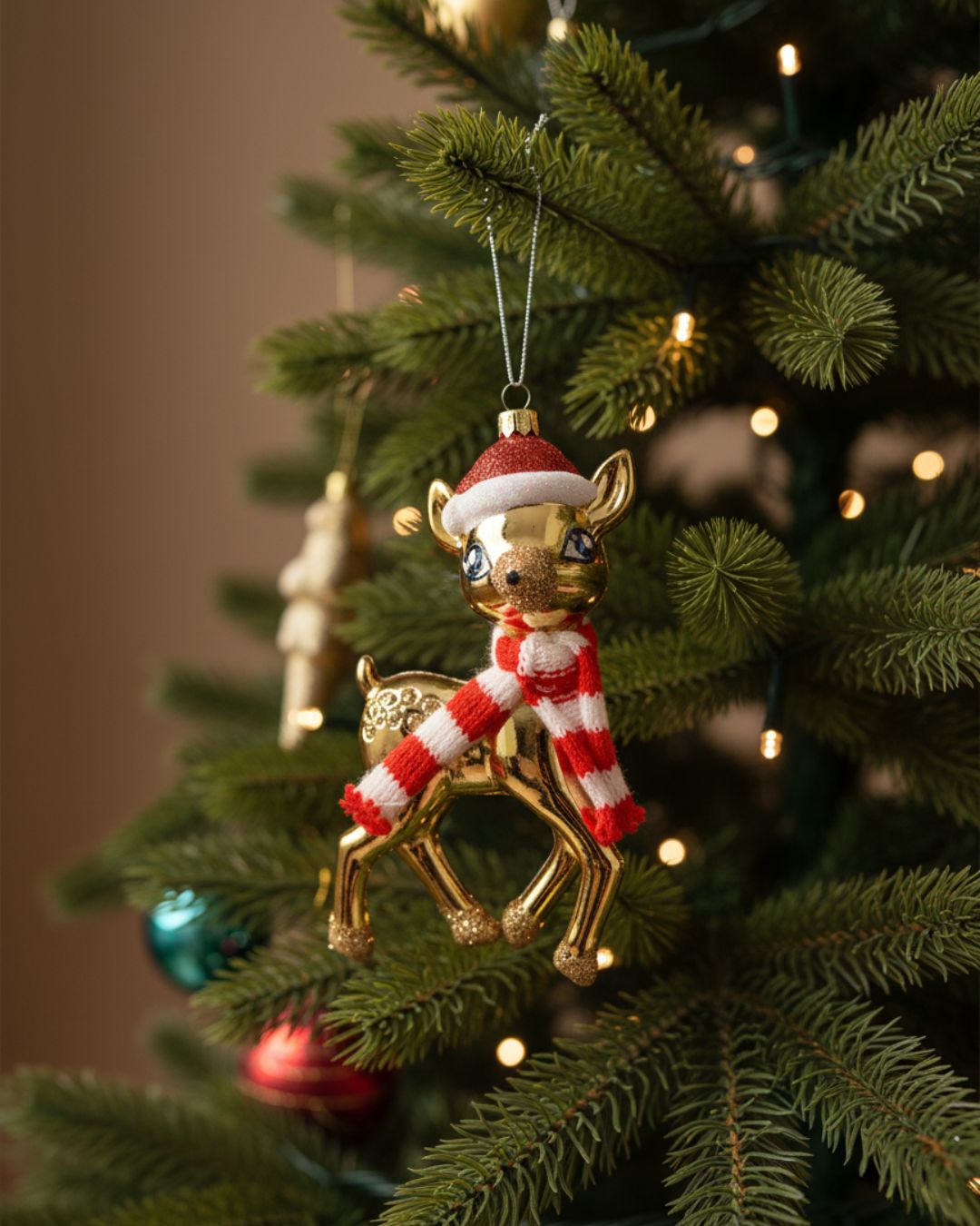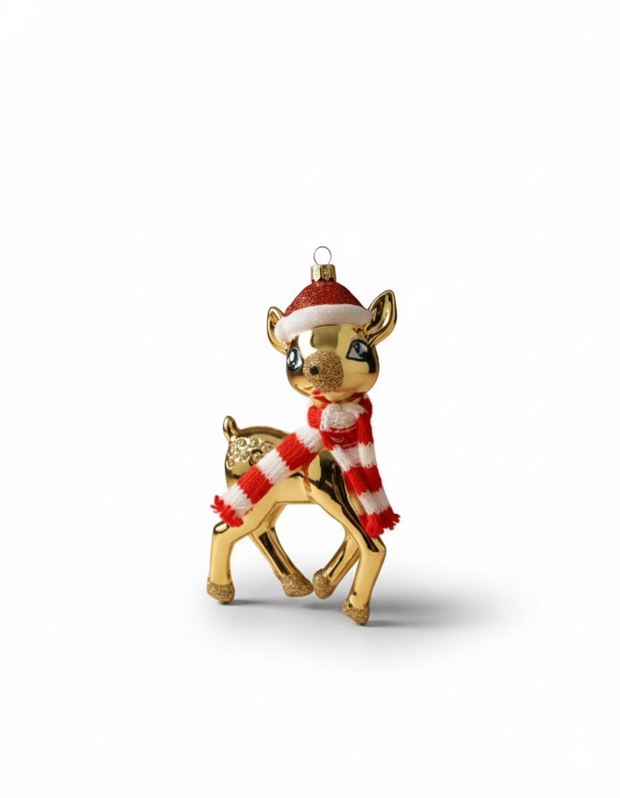 Adorno navideño de reno dorado con gorro y bufanda decorativa.