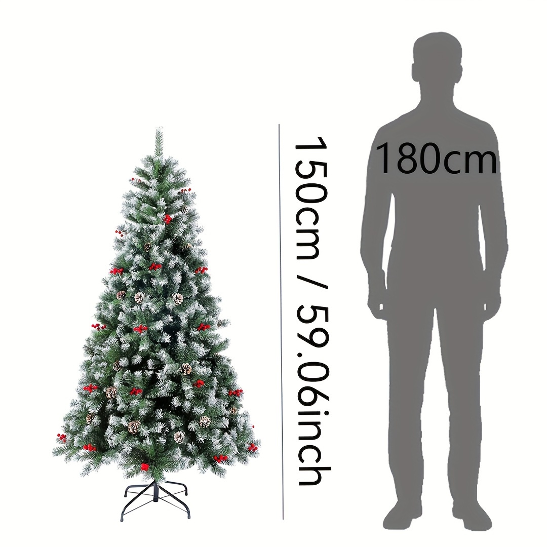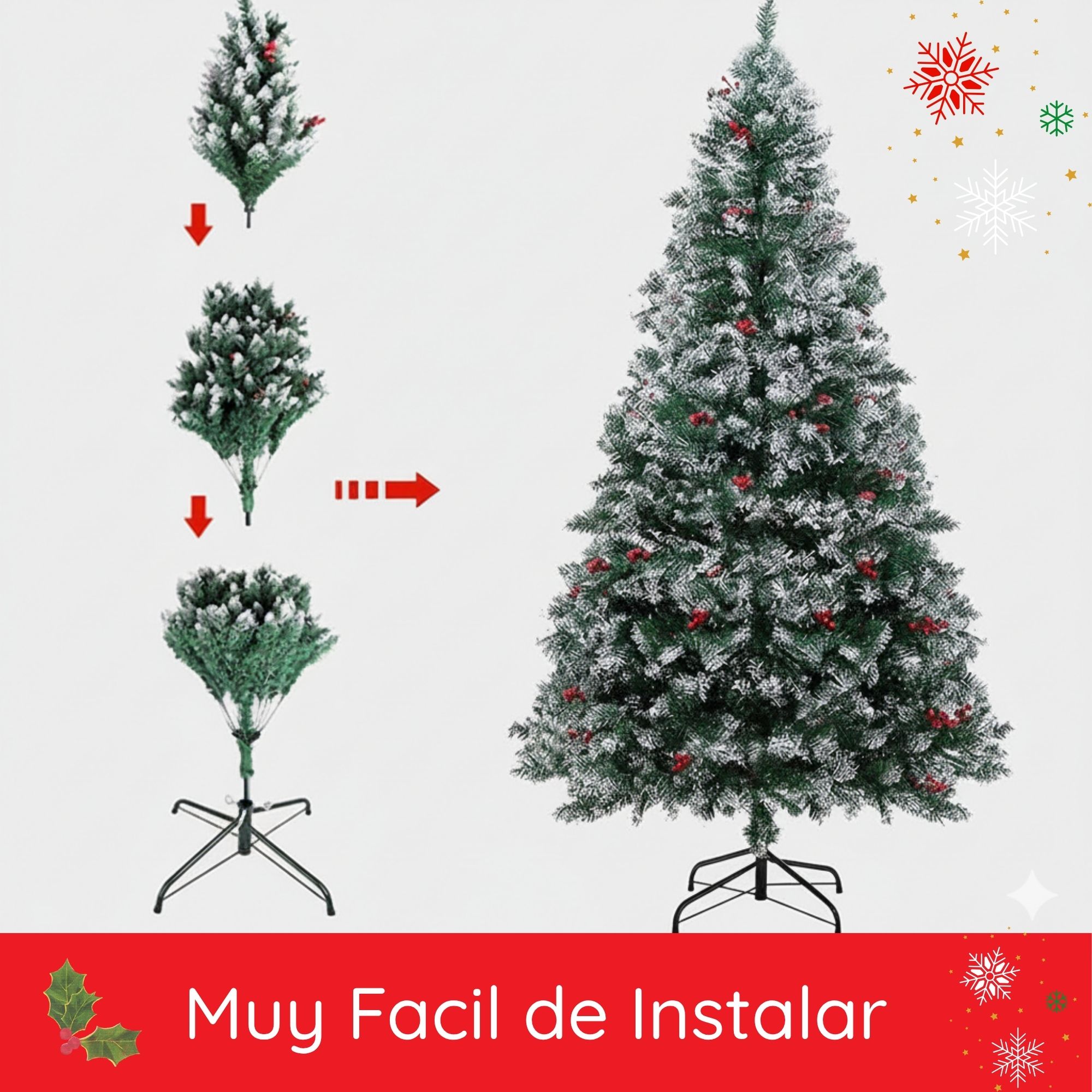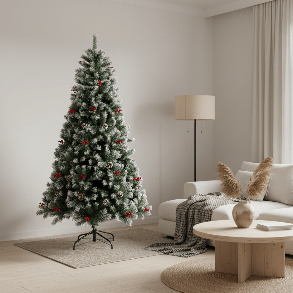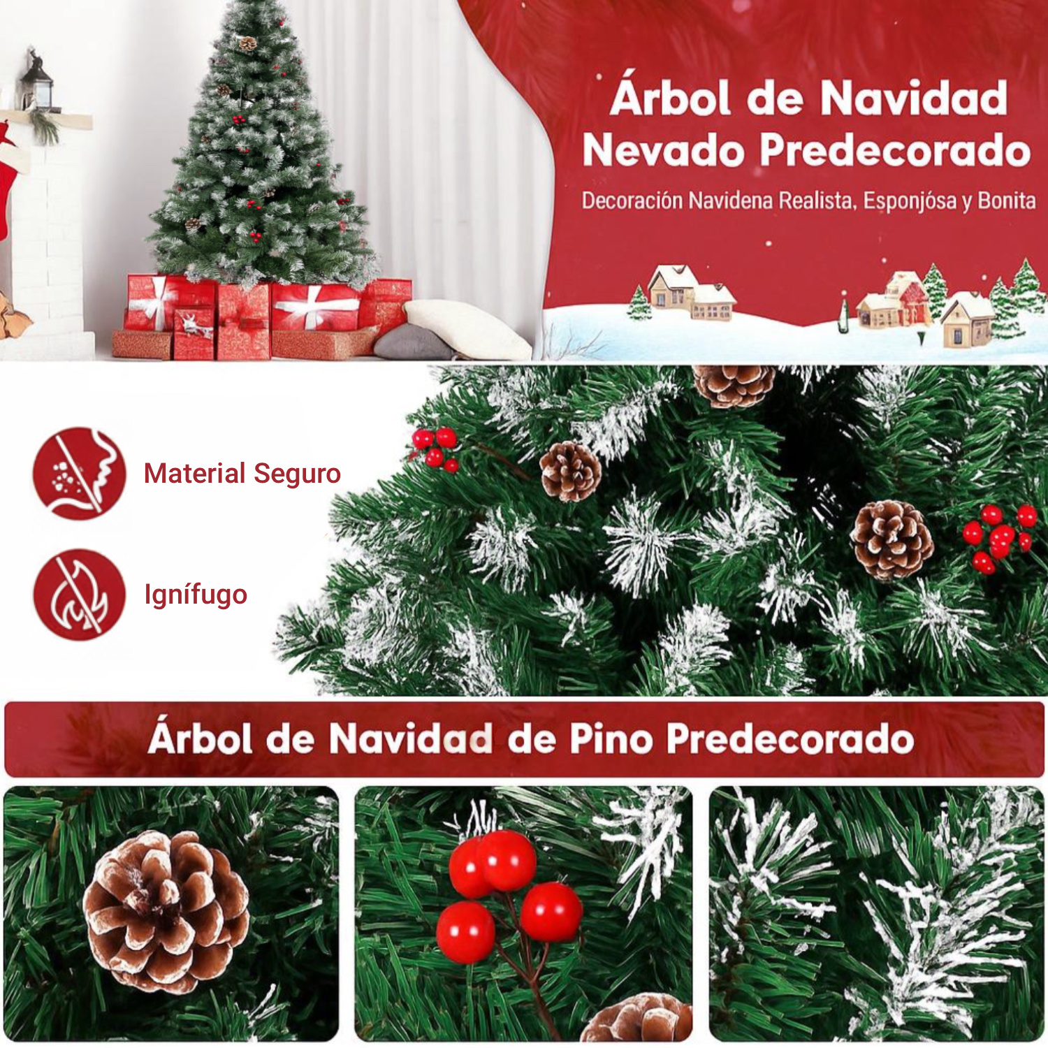 Árbol de Navidad con efecto nieve, decorado con piñas naturales y frutos rojos.