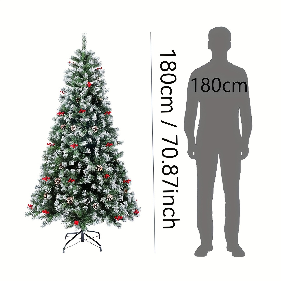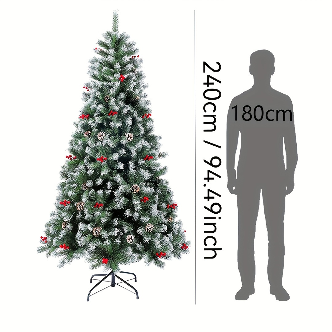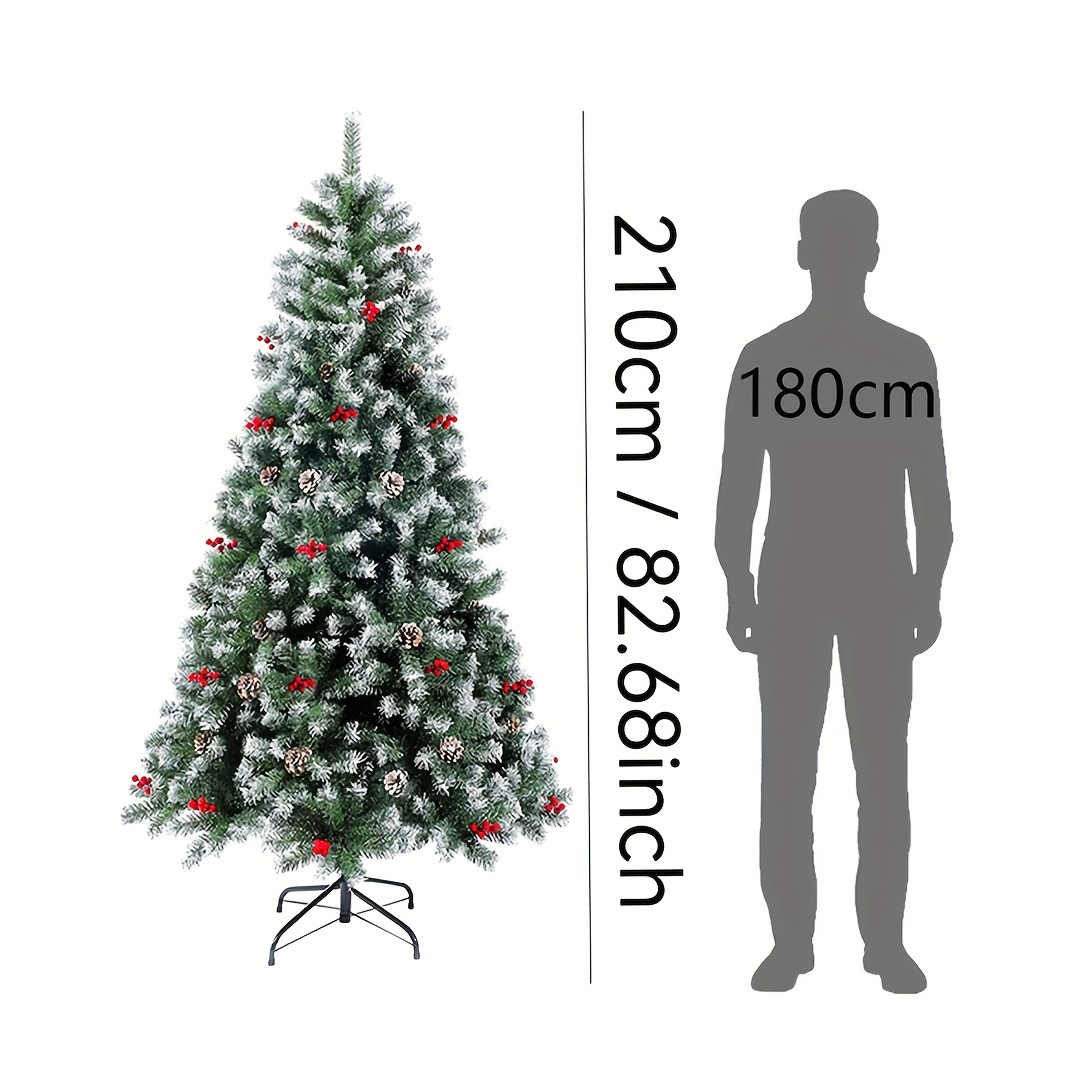 Árbol de Navidad con efecto nieve, decorado con piñas naturales y frutos rojos.