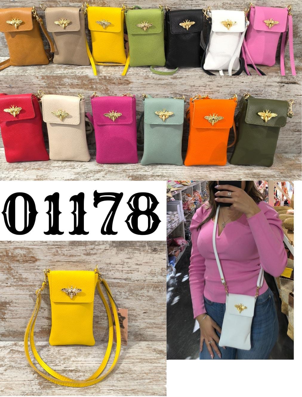 • Funda para móvil con cierre en abeja, interior  forrado, asa larga ajustable.