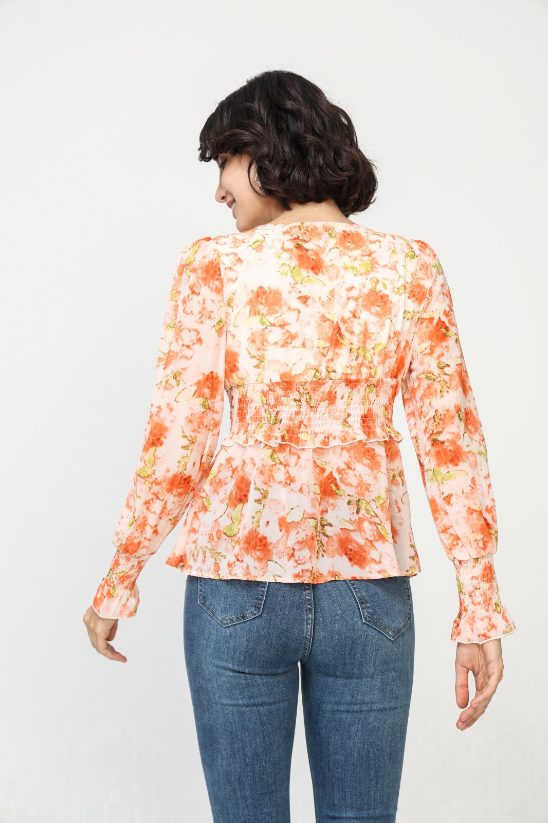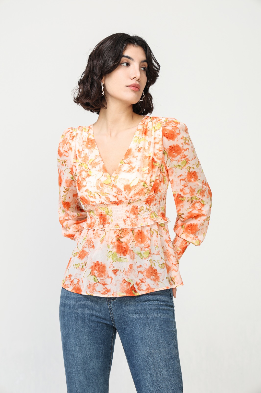 Blusa Ajustada Flores Naranjas Escote Pico