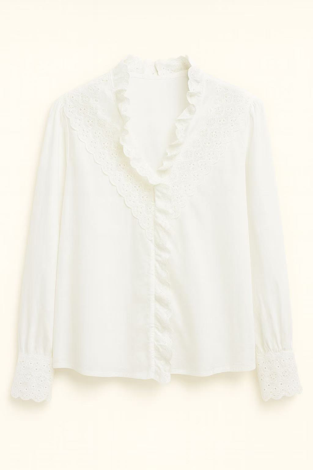 Blusa Blanca Escote V con Volante Calado Manga Larga