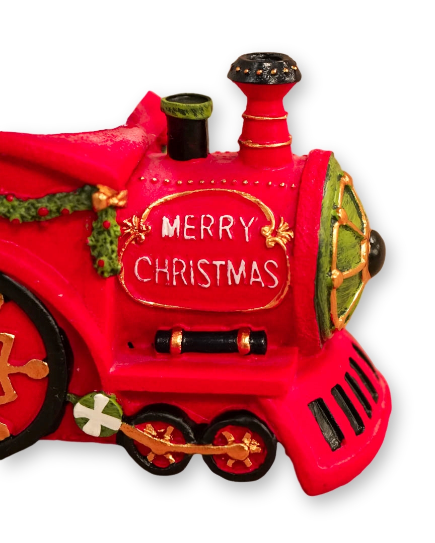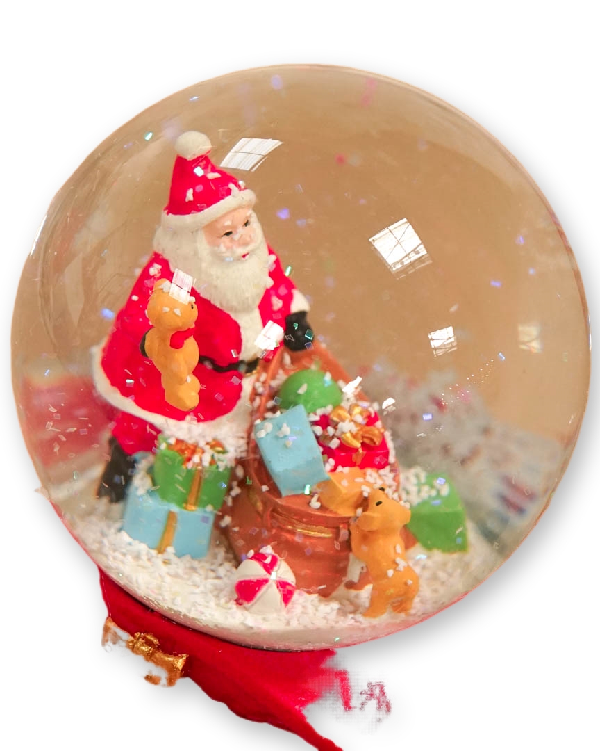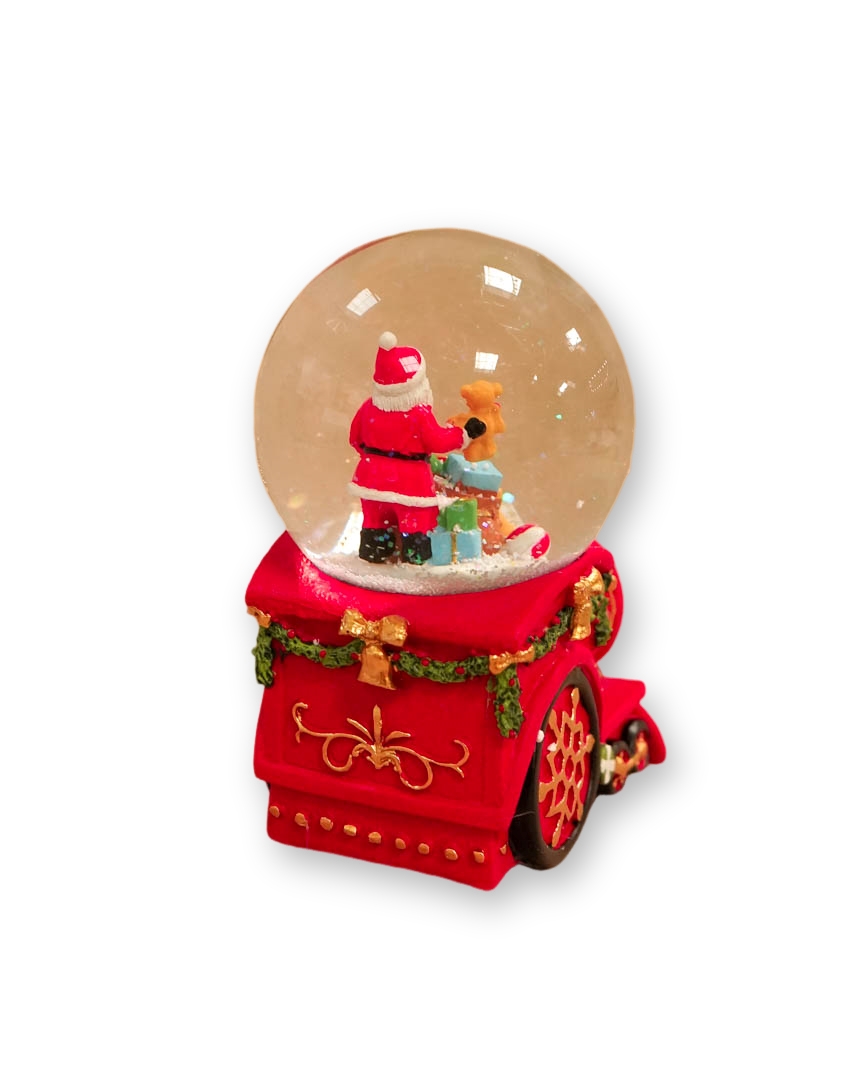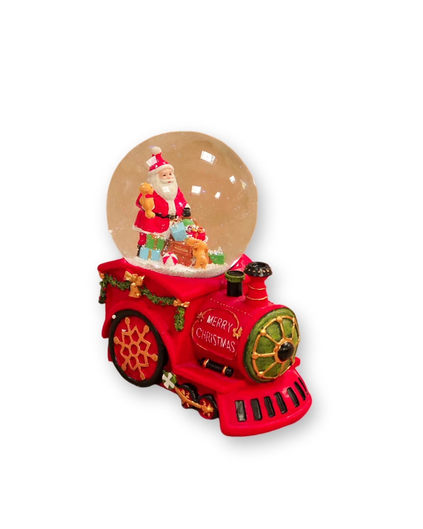 • Es una bola de nieve de Papa Noel, con una caja de música incorporada al darle cuerda, suena la música. La bola de nieve esta incorporada en un tren rojo decorado de navidad.