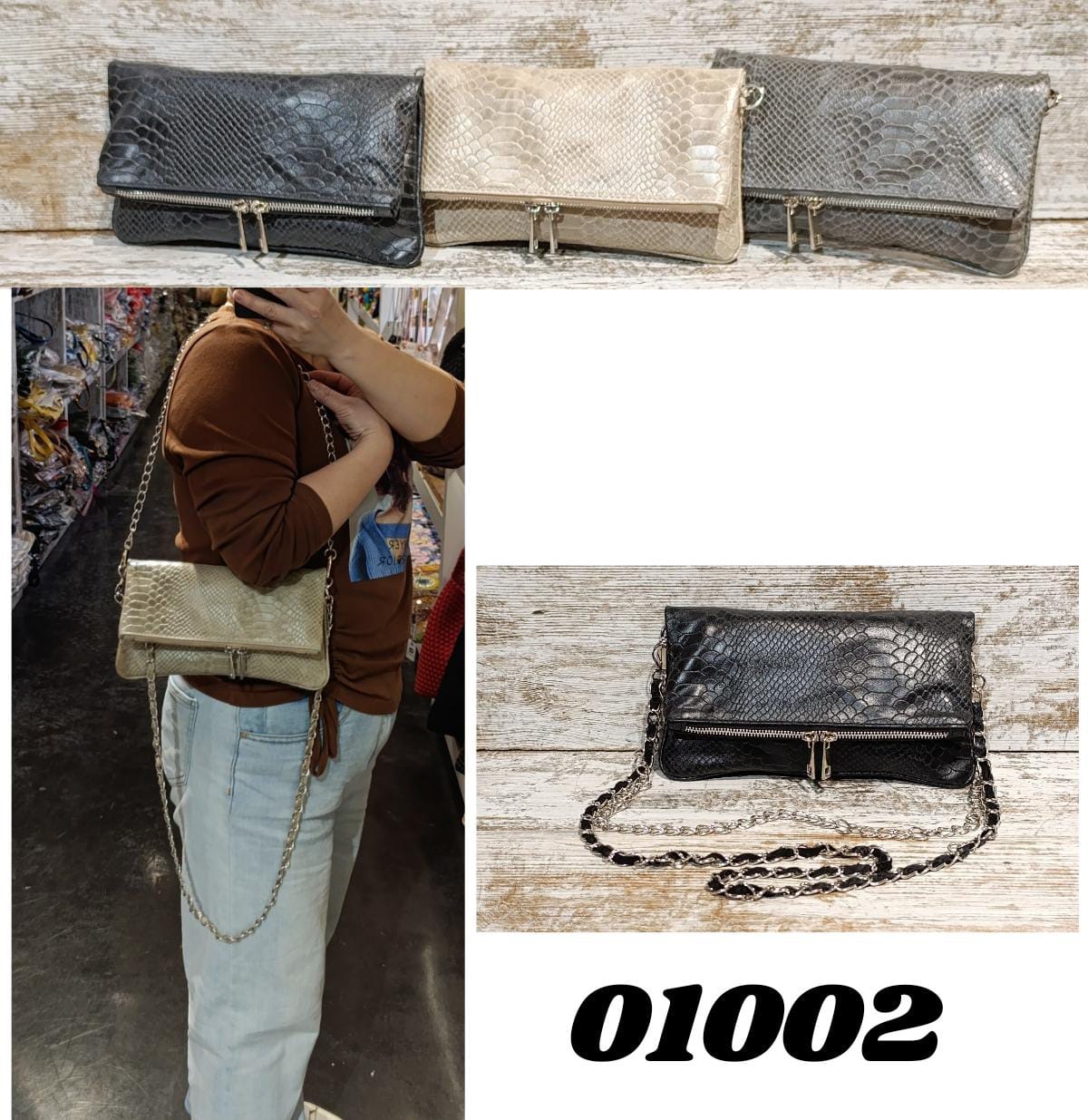 • Bolso bandolera con grabado de escamas, cierre en cremallera y en imán en la  solapa, interior forrado, asa corta y asa larga ambas de cadena, detrás tiene un bolsillo con cierre en cremallera.