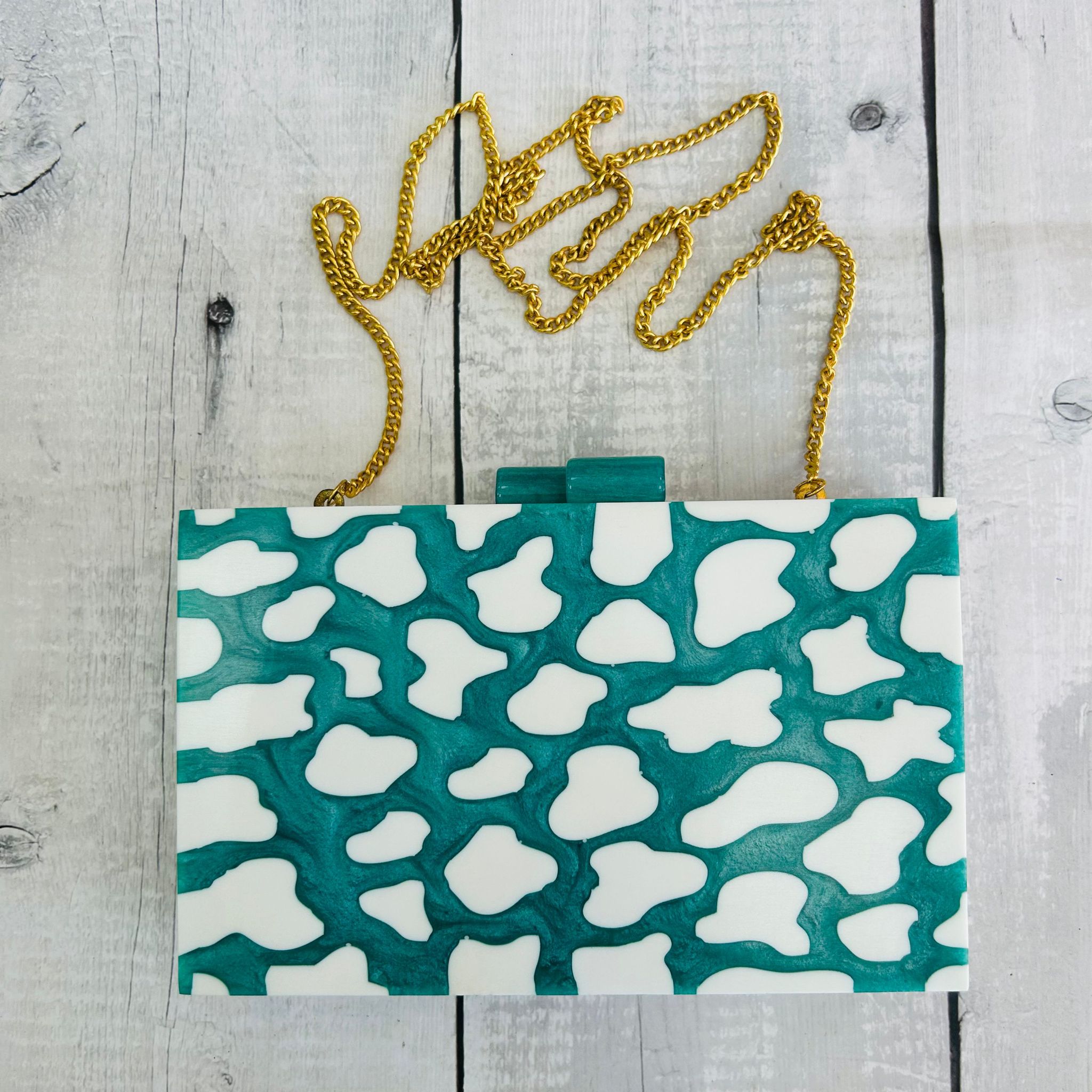 Bolso Cluth Rígido Nacarado Turquesa Machitas Blancas