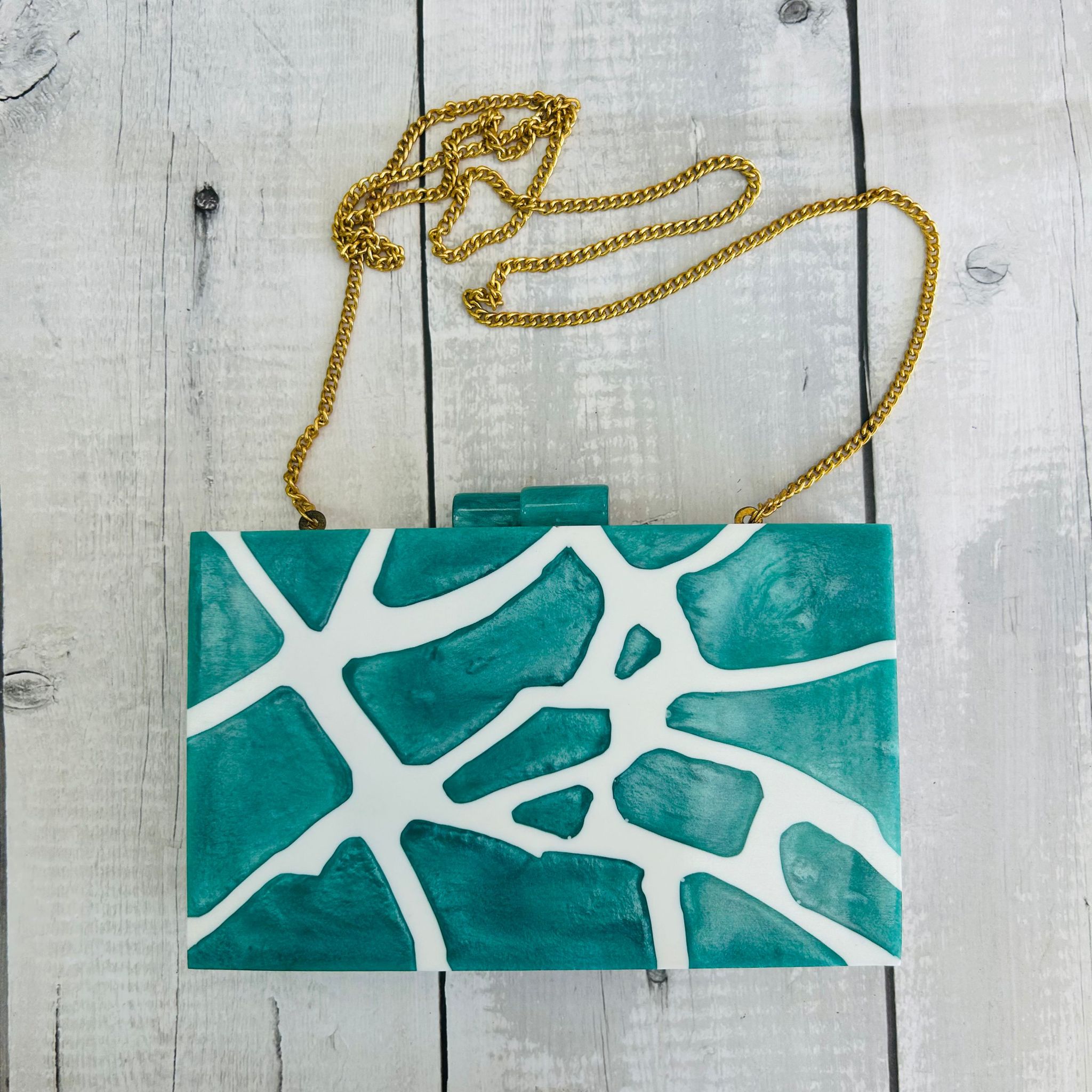 Bolso Cluth Rígido Nacarado Turquesa y Blanco