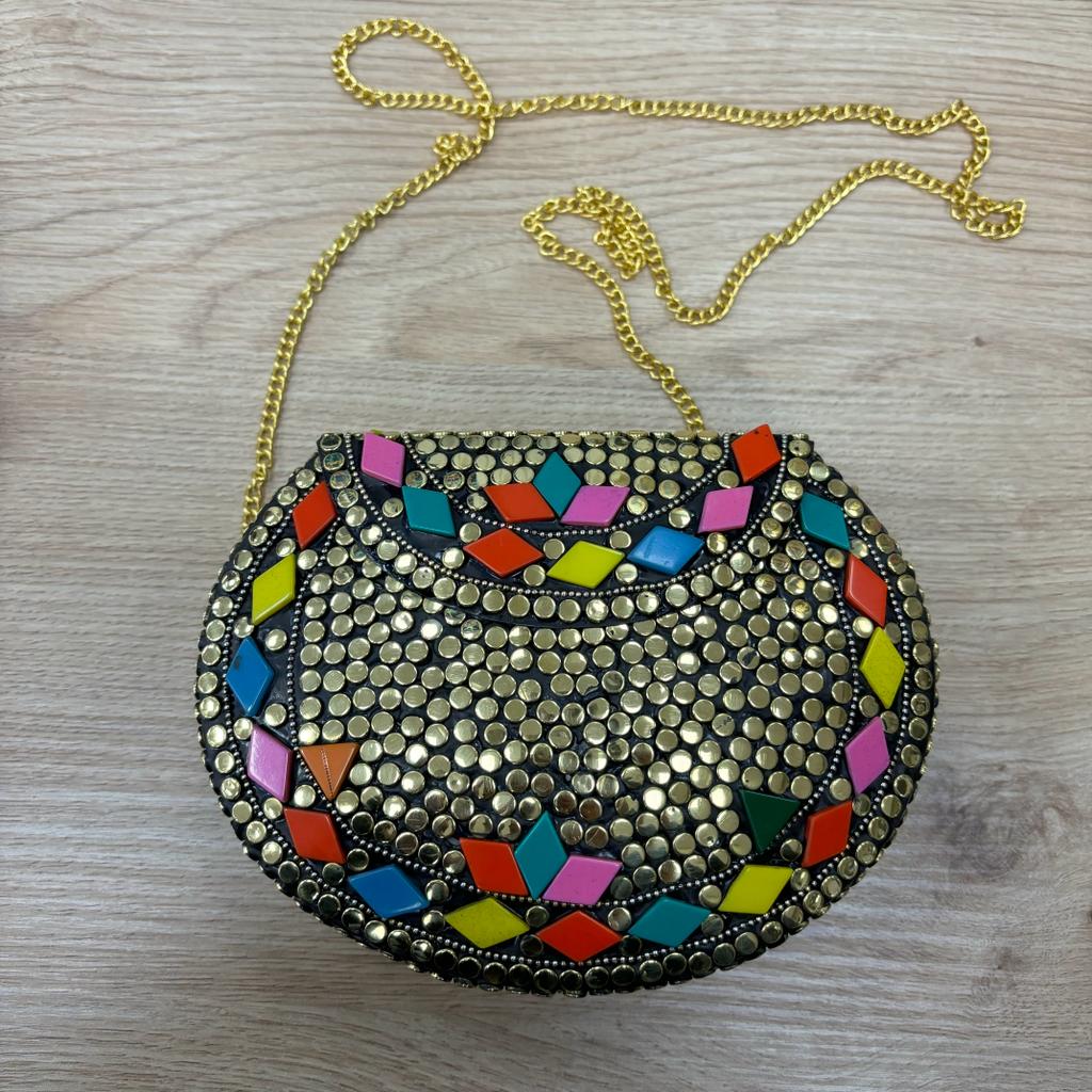 Bolso Rígido Redondo Con Piedras Dorado