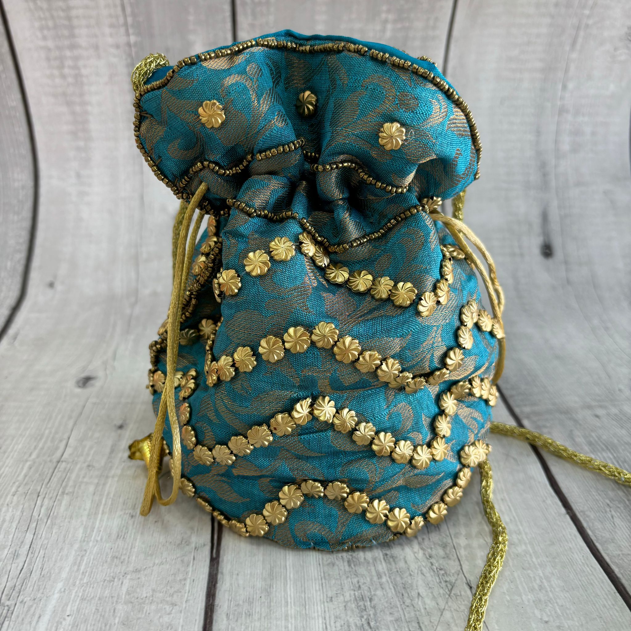 Bombonera Turquesa Tela Detalles Dorados Zig Zag