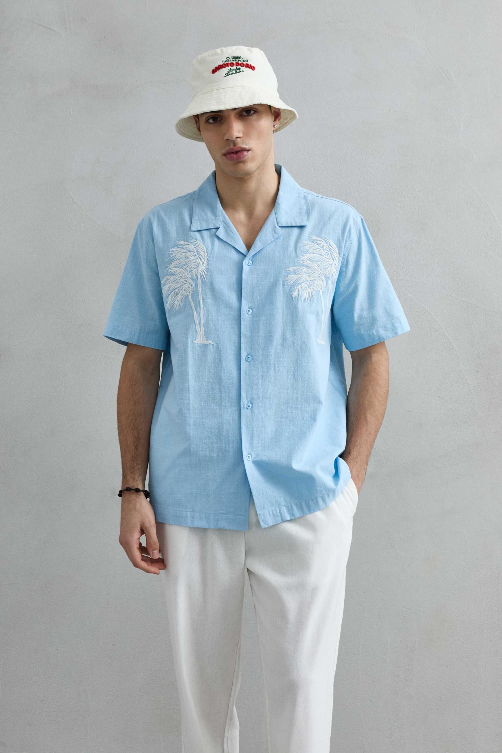 Camisa Azul Algodón Bordada Estilo Lino