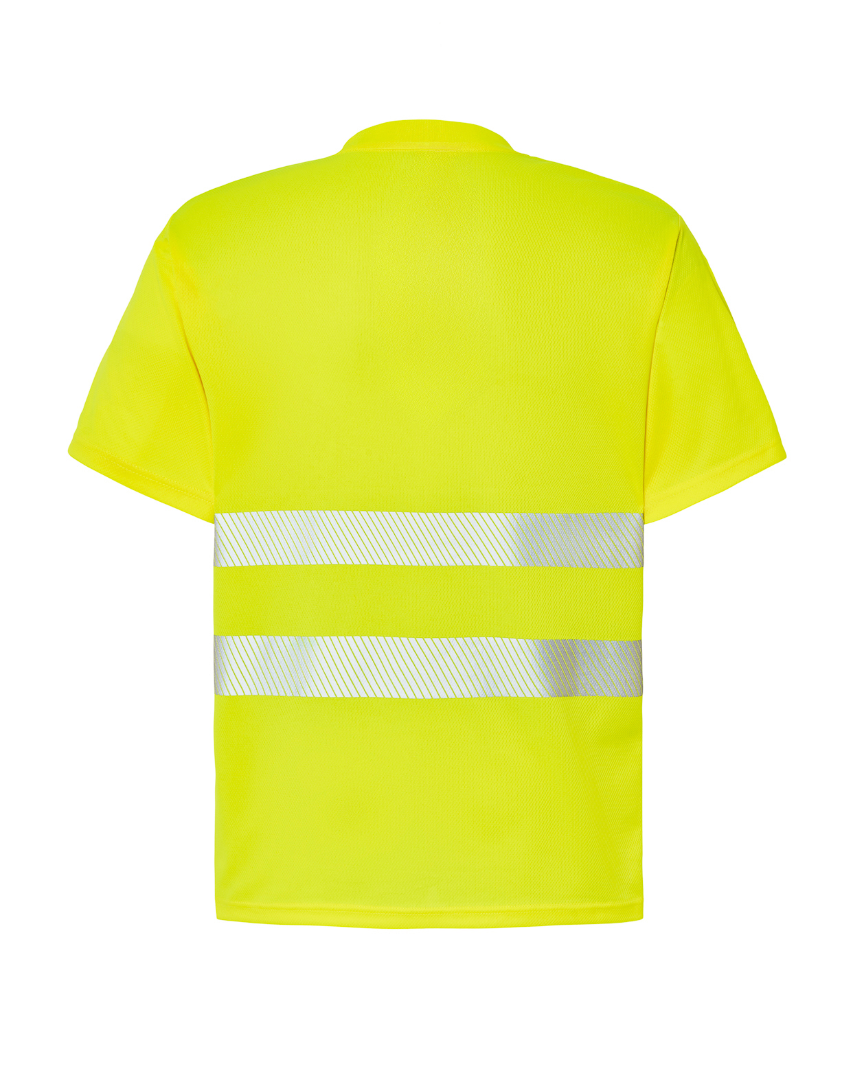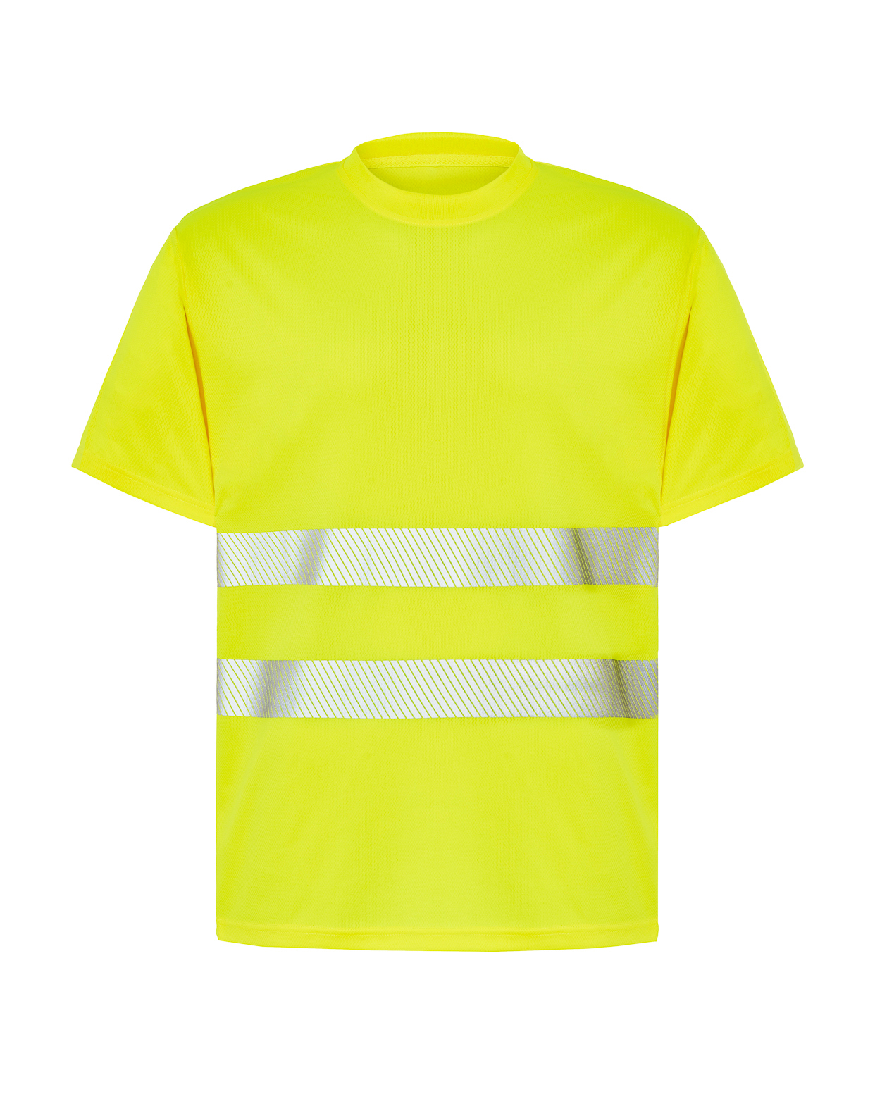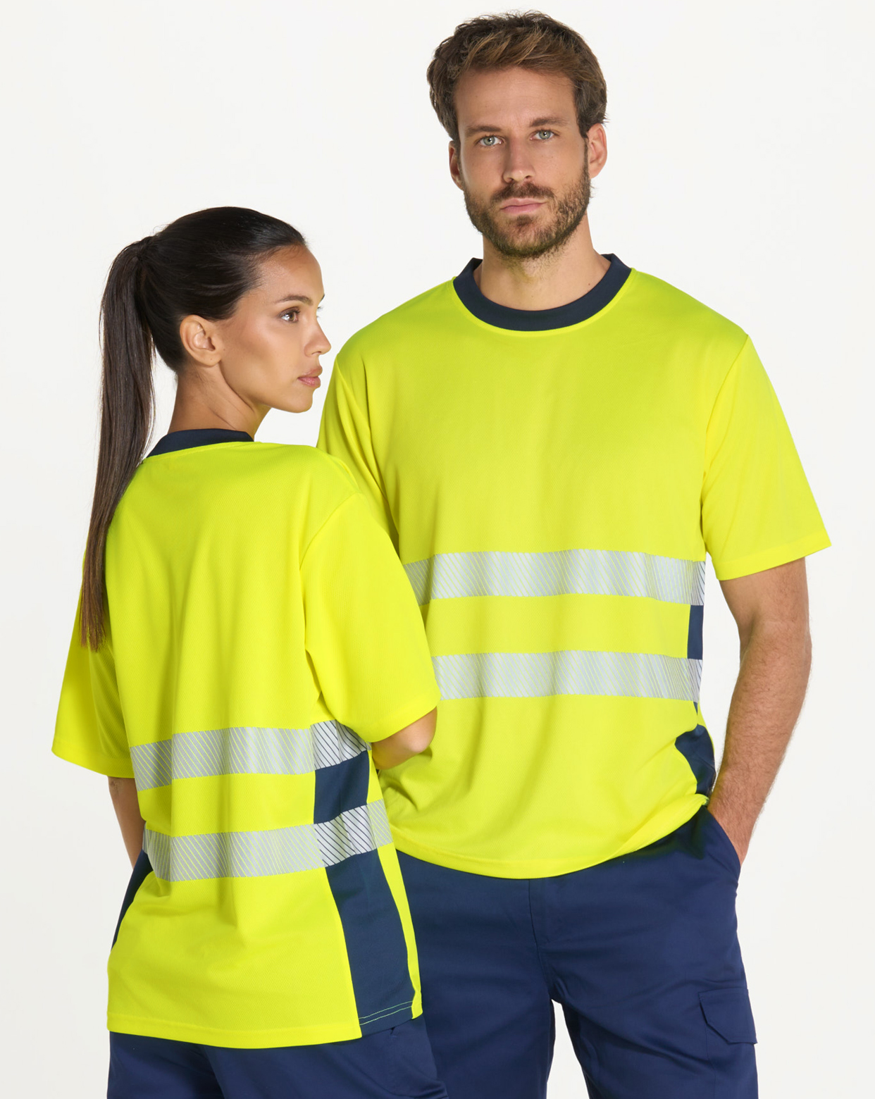 Composición técnica: 100% poliéster bird-eye 140 gr/m². Cuello redondo de canalé con cubre costuras. Doble costura reforzada en mangas y bajo. Dos cintas reflectantes segmentadas termoselladas. Tratamiento antibacteriano con iones de plata. Disponible en varios colores y tallas.