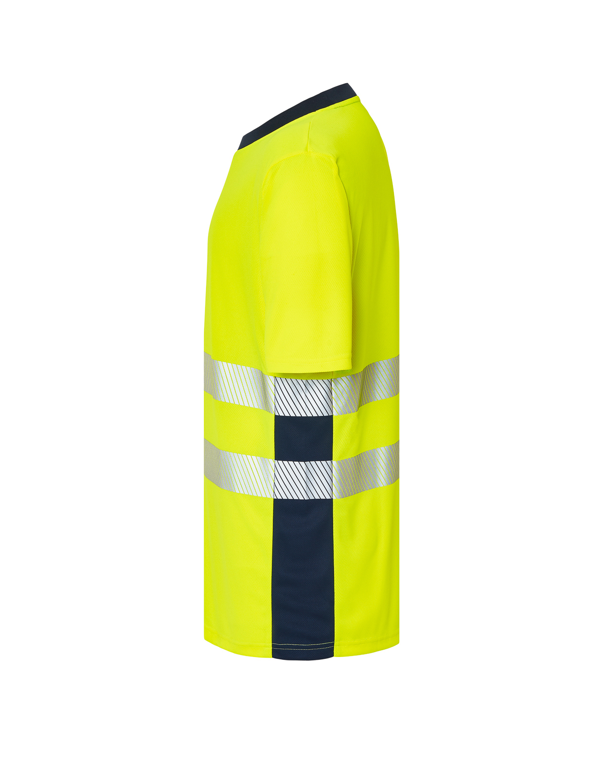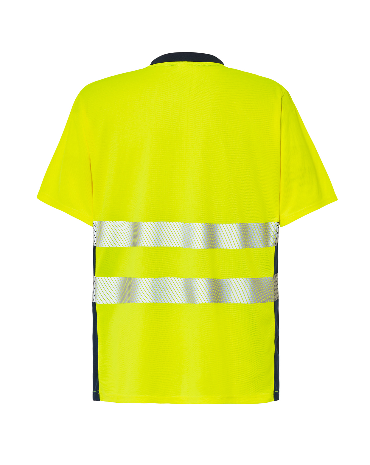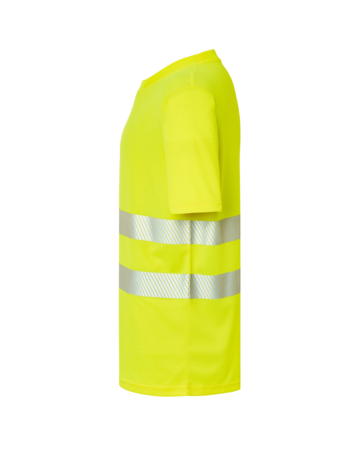 Composición técnica: 100% poliéster bird-eye 140 gr/m². Cuello redondo de canalé con cubre costuras. Doble costura reforzada en mangas y bajo. Dos cintas reflectantes segmentadas termoselladas. Tratamiento antibacteriano con iones de plata. Disponible en varios colores y tallas.