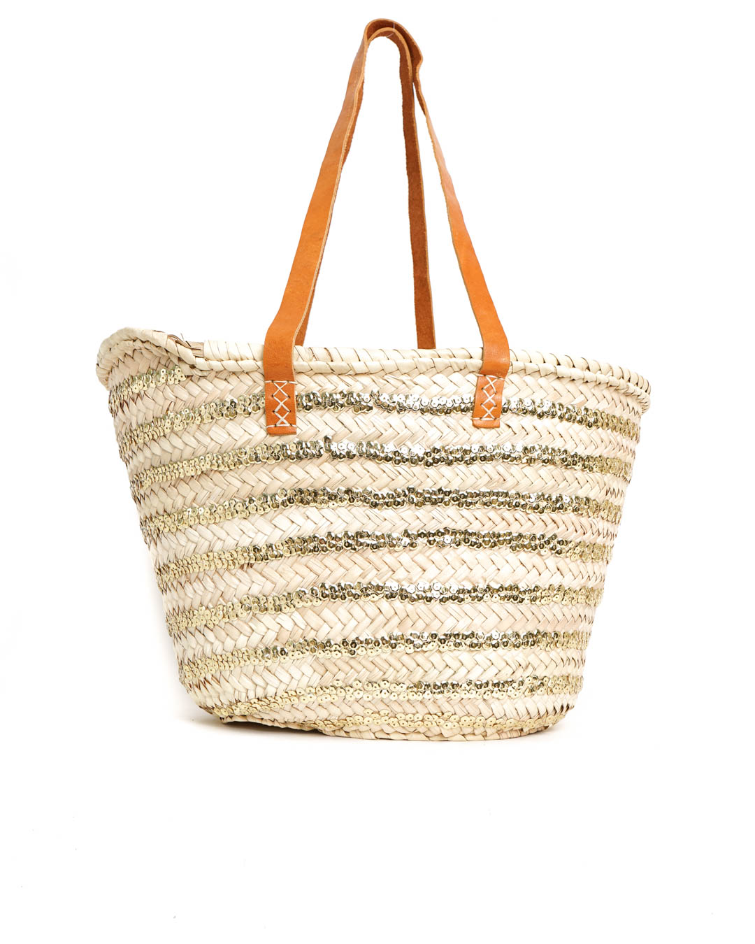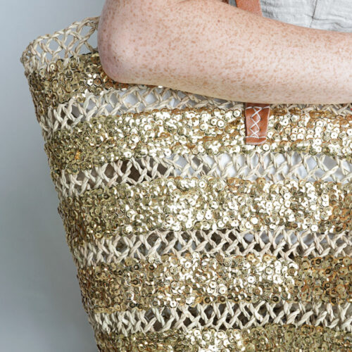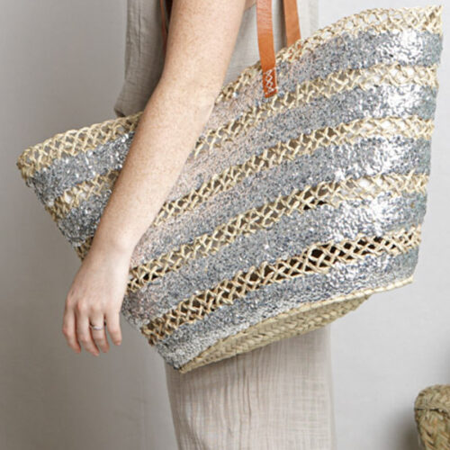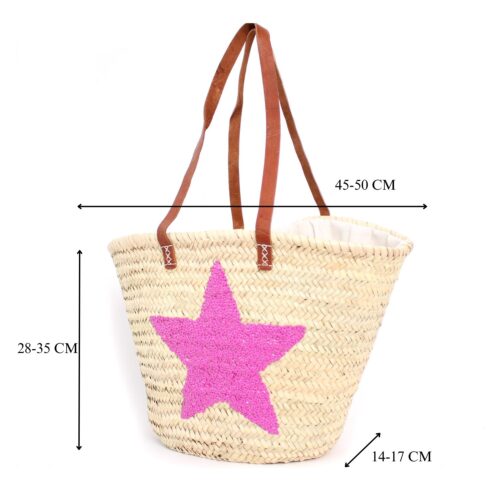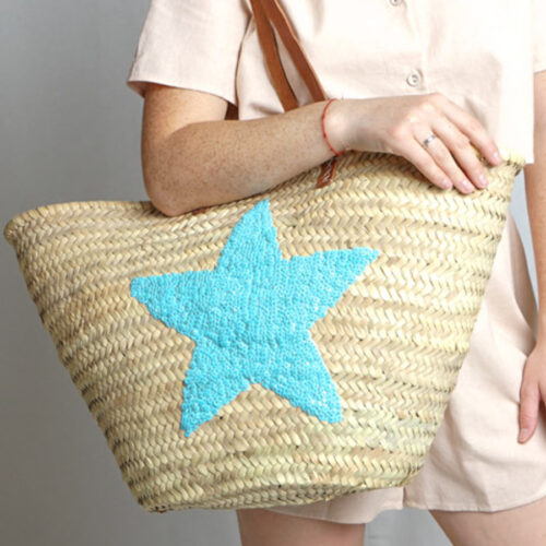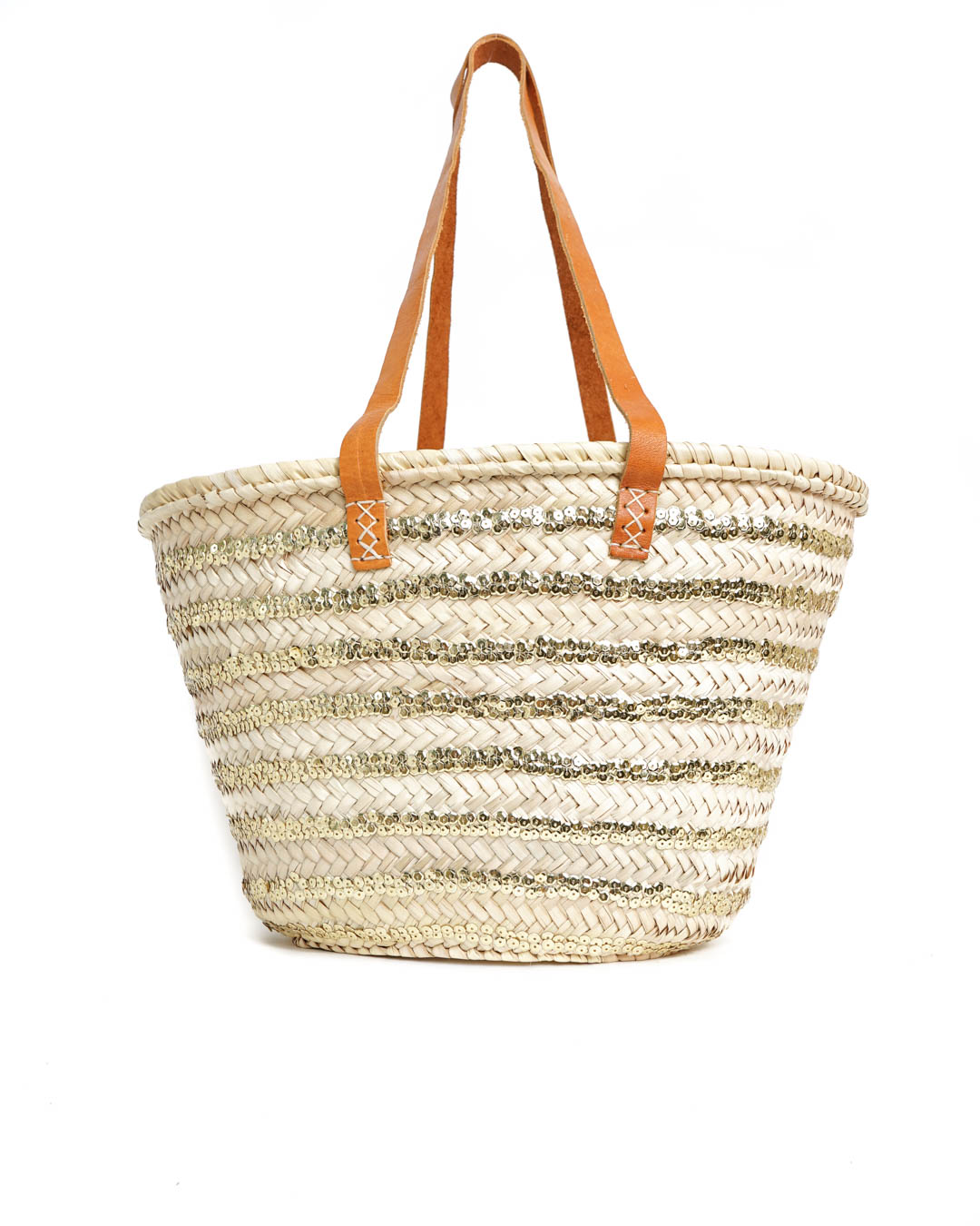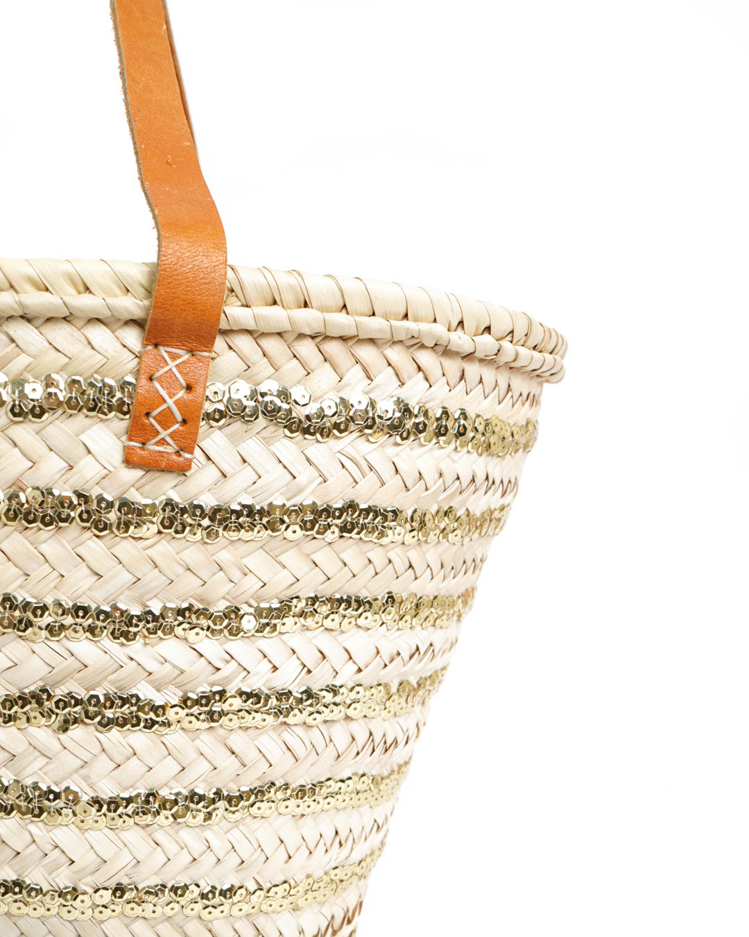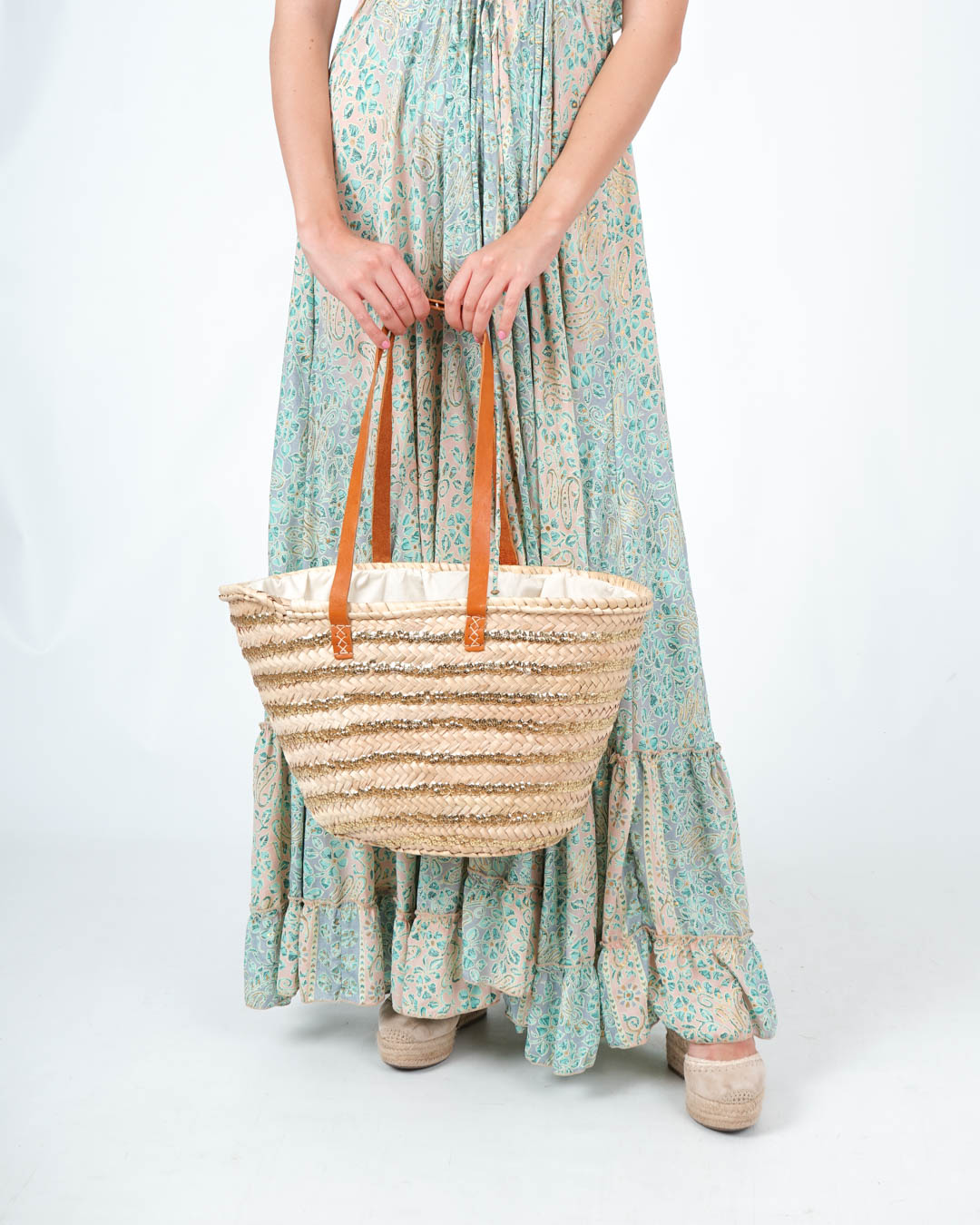 Capazo de Palma Natural con Asas de Piel y Lentejuelas Doradas