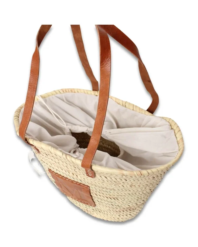 Capazo de Palma Natural Letras – Asa de Piel – 29 x 45 x 17 cm.