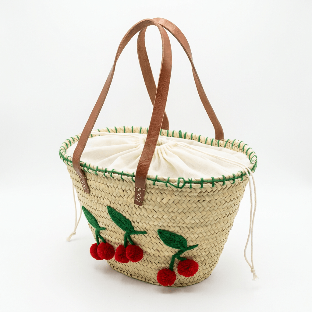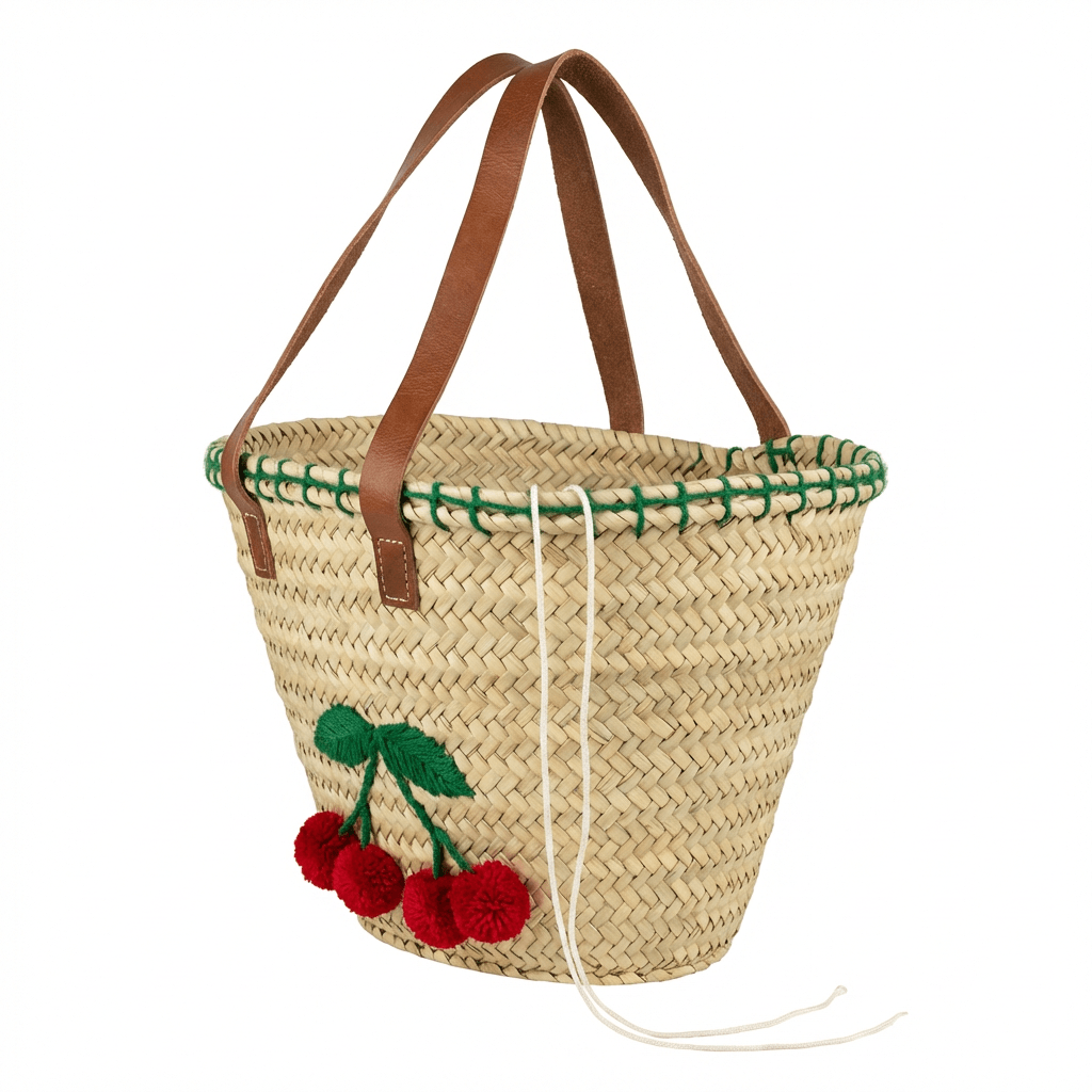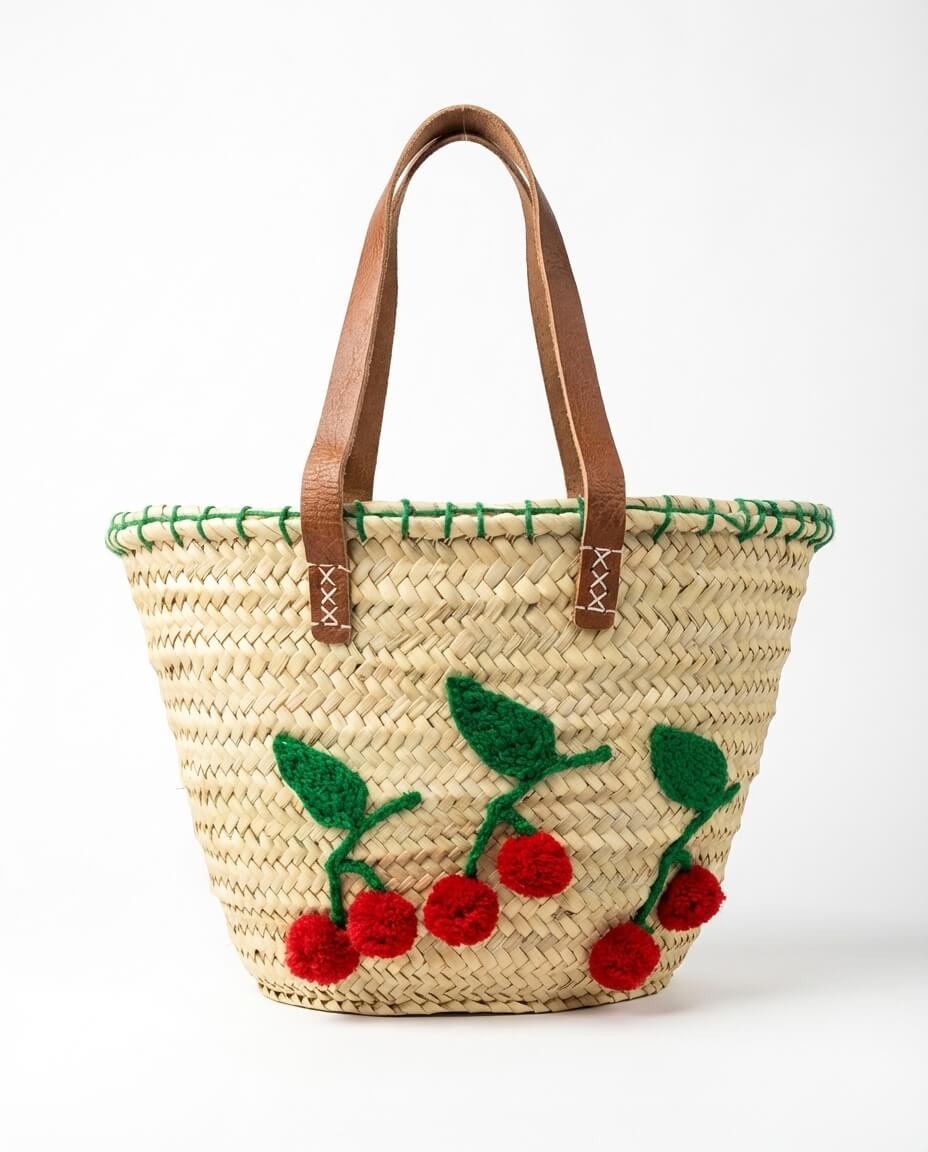 Este Capazo de Playa Cerezas bordadas. Elaborado de forma artesanal con palma natural y asas de piel, con cierre mediante tiras.