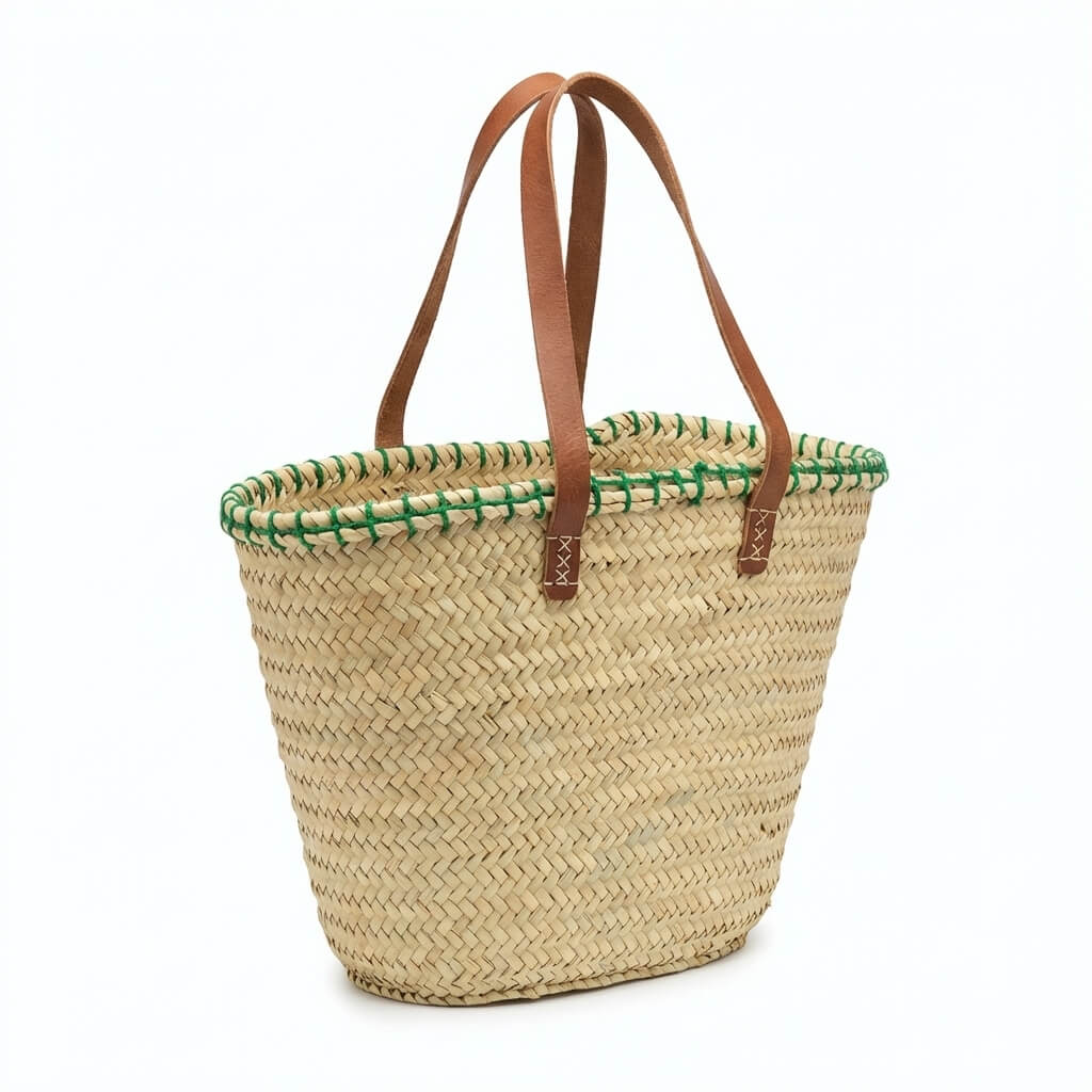 • Material: palma natural y asas de piel