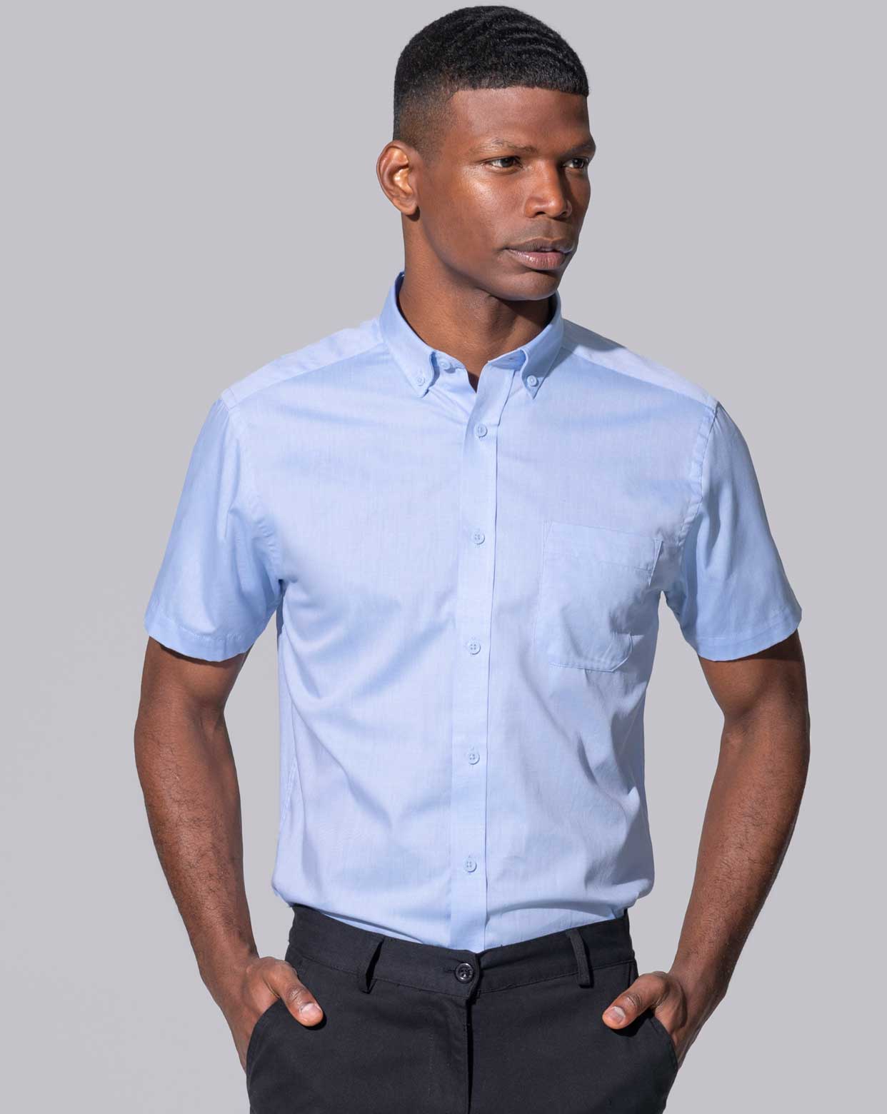 🧵 Diseñada con botones en el cuello tipo button-down y botones a tono que aportan elegancia discreta. El bolsillo delantero en lado izquierdo aumenta la practicidad. Manga corta ideal para climas cálidos o entornos de trabajo con temperatura controlada. Tela Oxford de grosor superior garantiza durabilidad en uso intensivo.