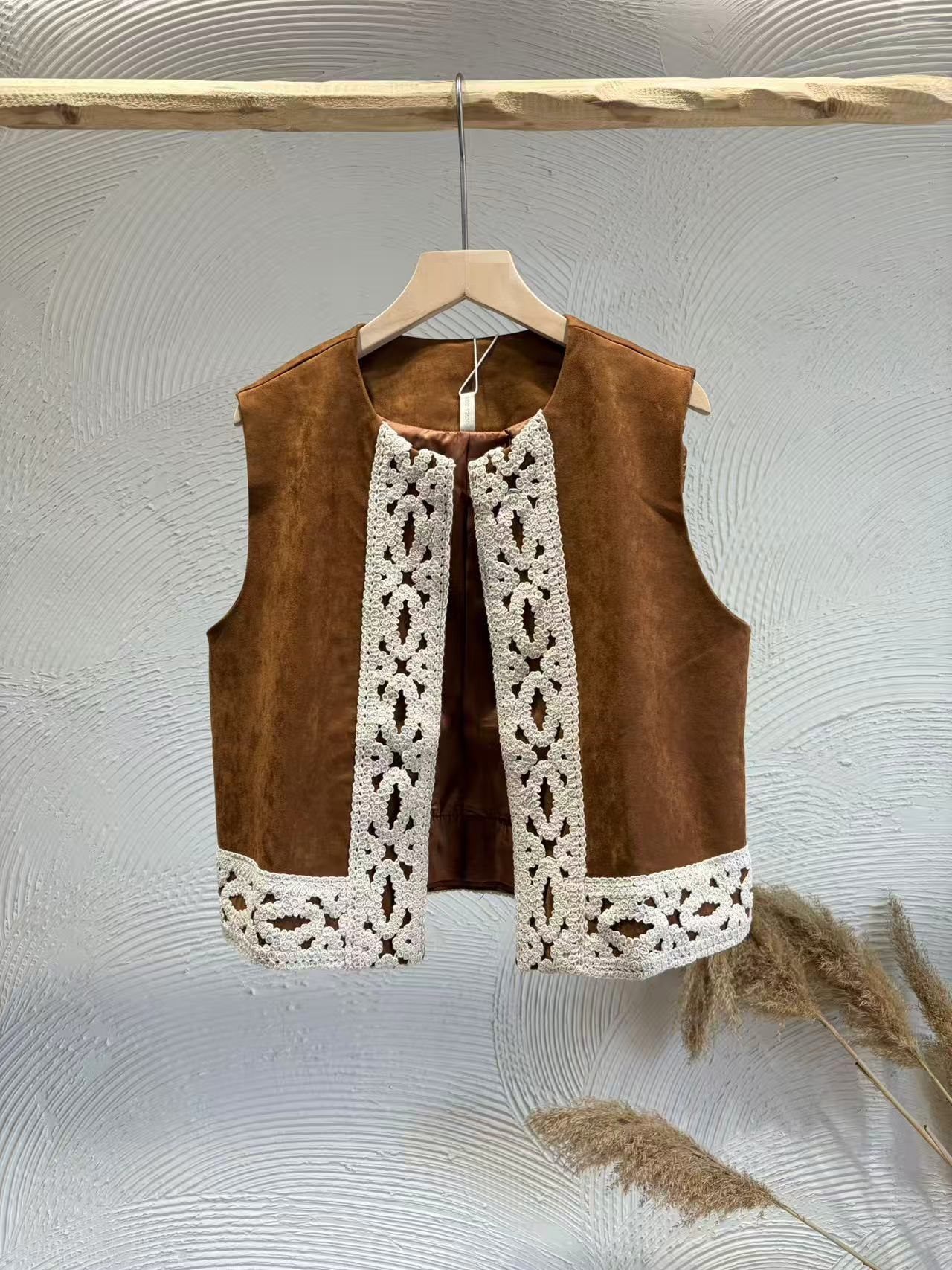 Chaleco Camel Efecto Antelina Detalles Calados