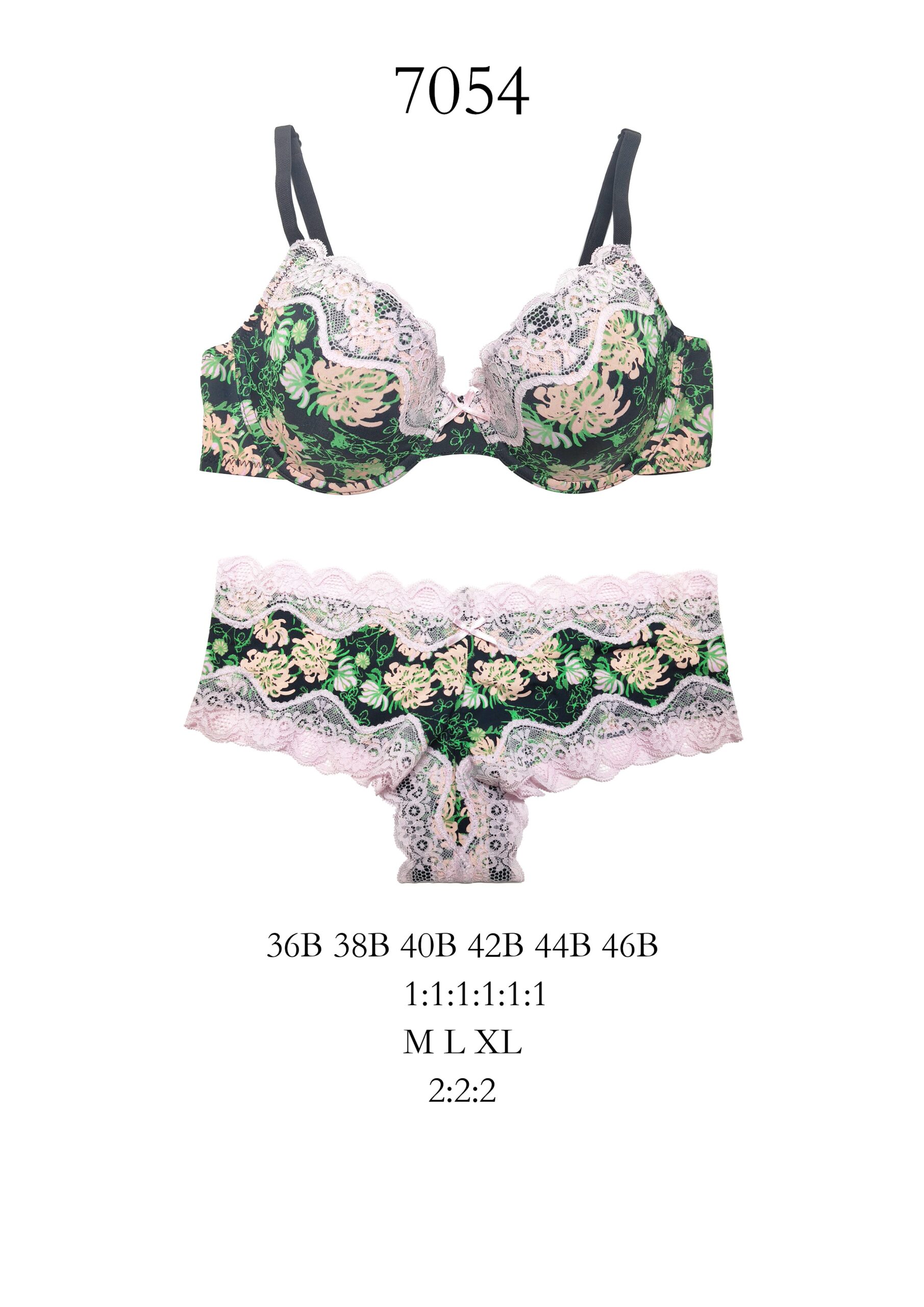 Conjunto Negro Estampado Floral con Encaje Sujetador Copa B y Braga