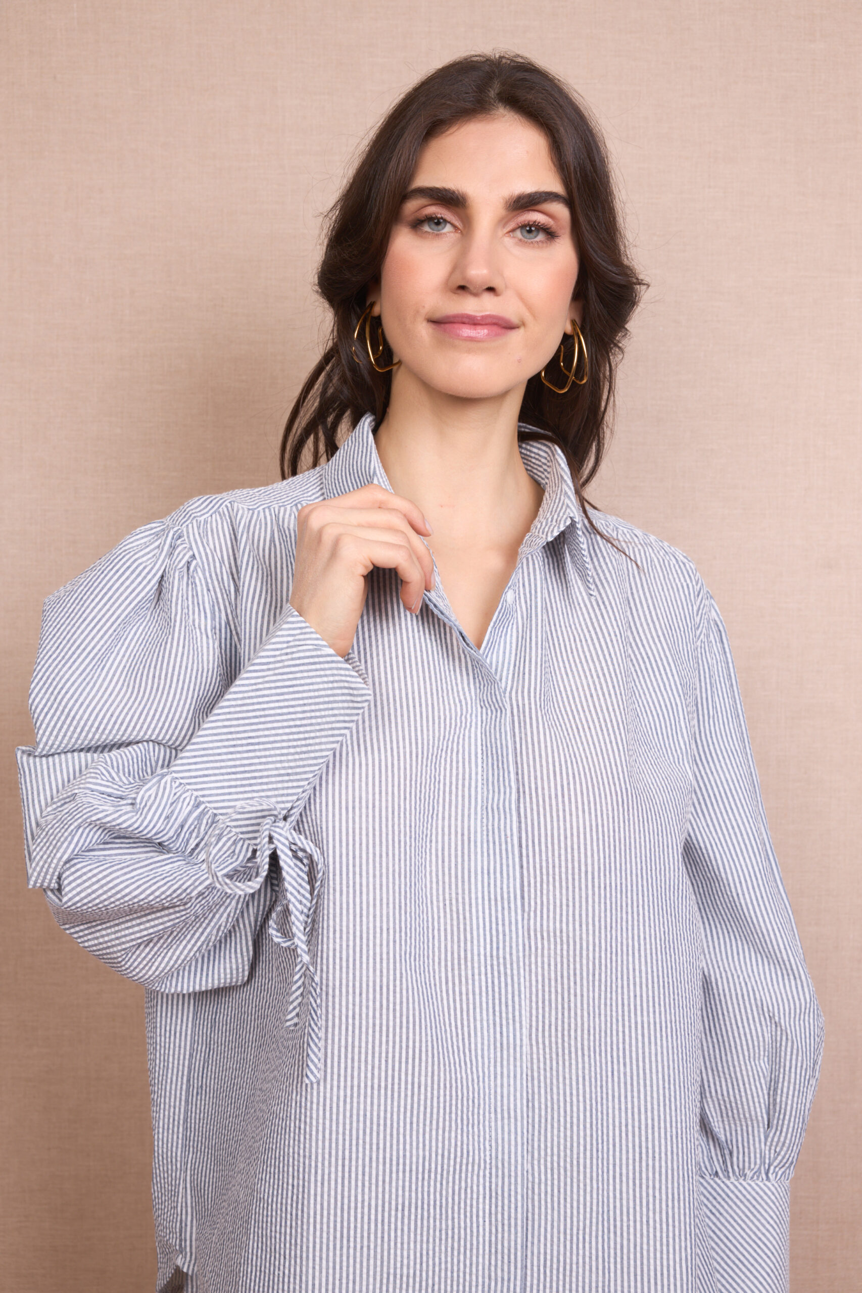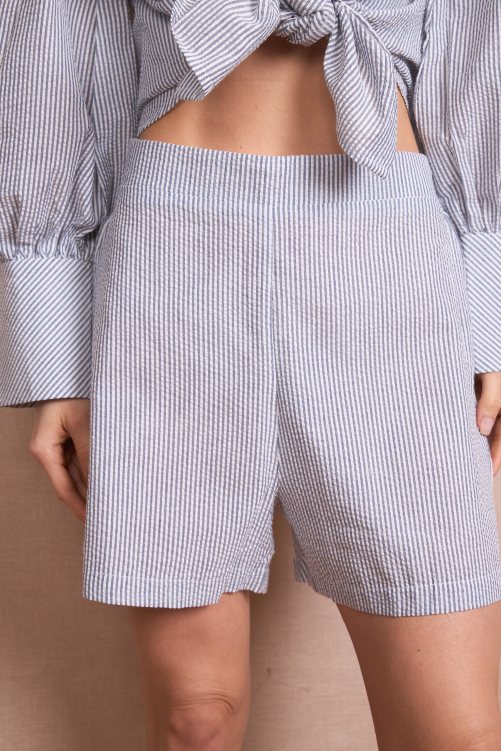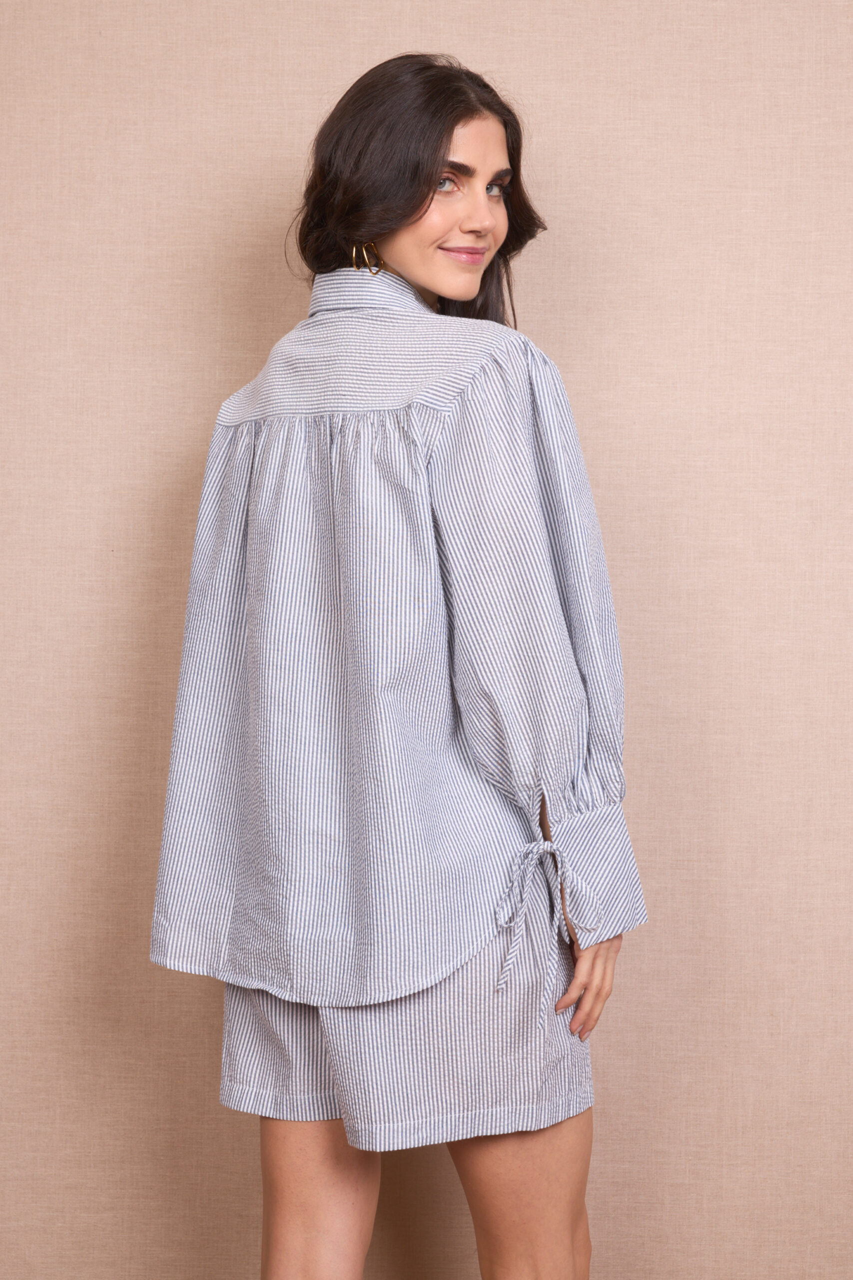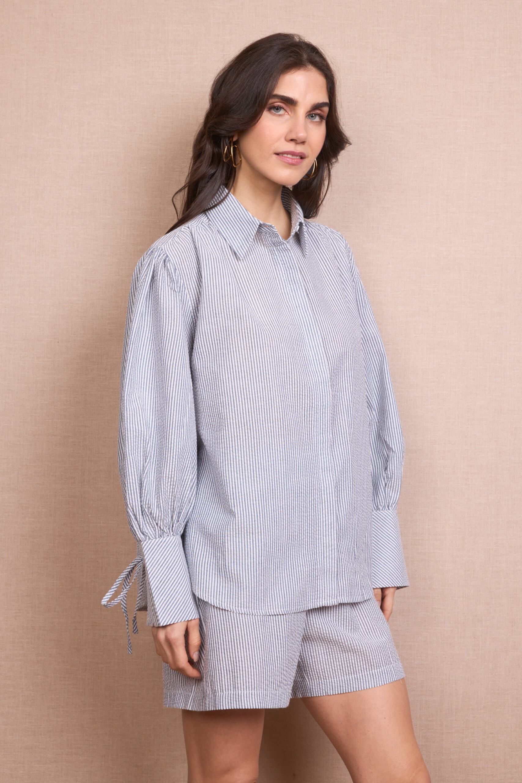 Conjunto Rayas Pantalón Corto y Camisa Manga Larga Abullonada Lazos