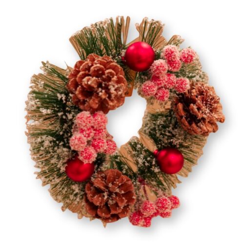 Base de ramas naturales con detalles de pino y bayas rojas.