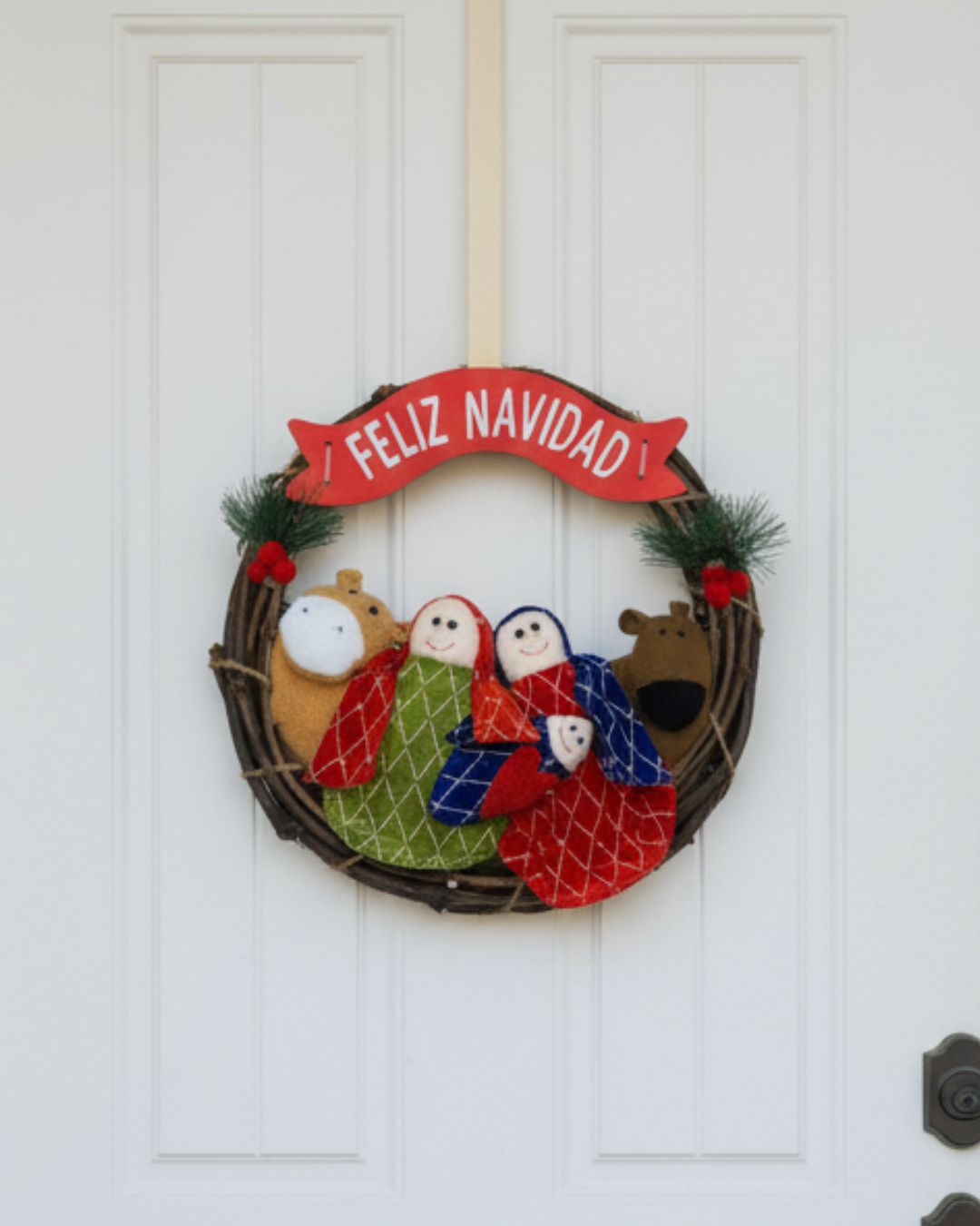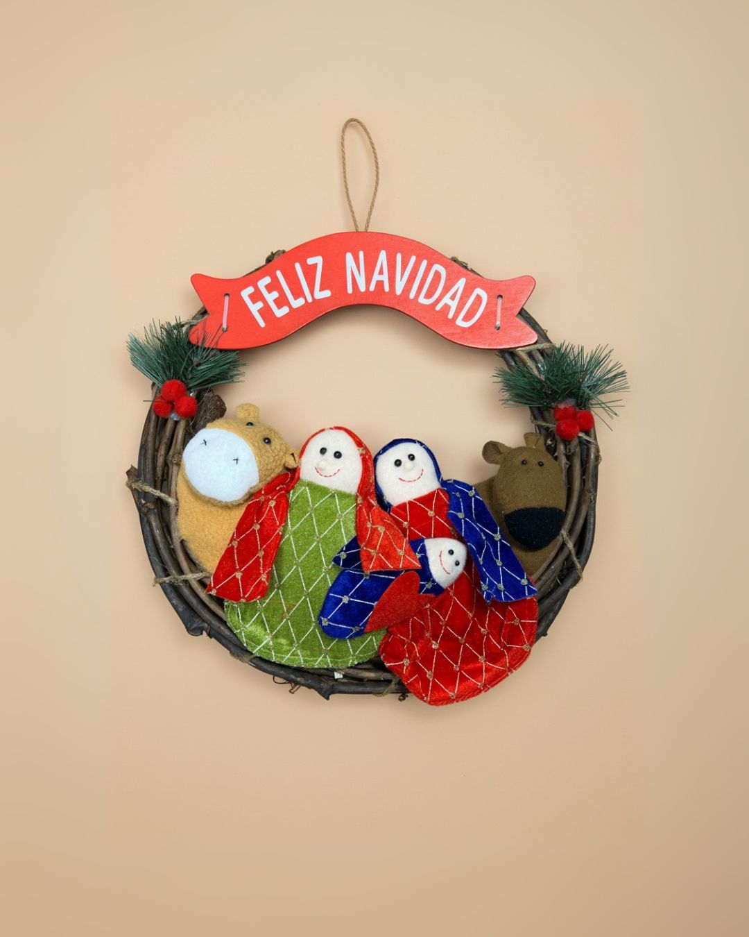 El cartel superior con el mensaje “¡Feliz Navidad!” completa el diseño, convirtiéndola en el detalle perfecto para decorar puertas, paredes o interiores con un toque cálido y familiar.