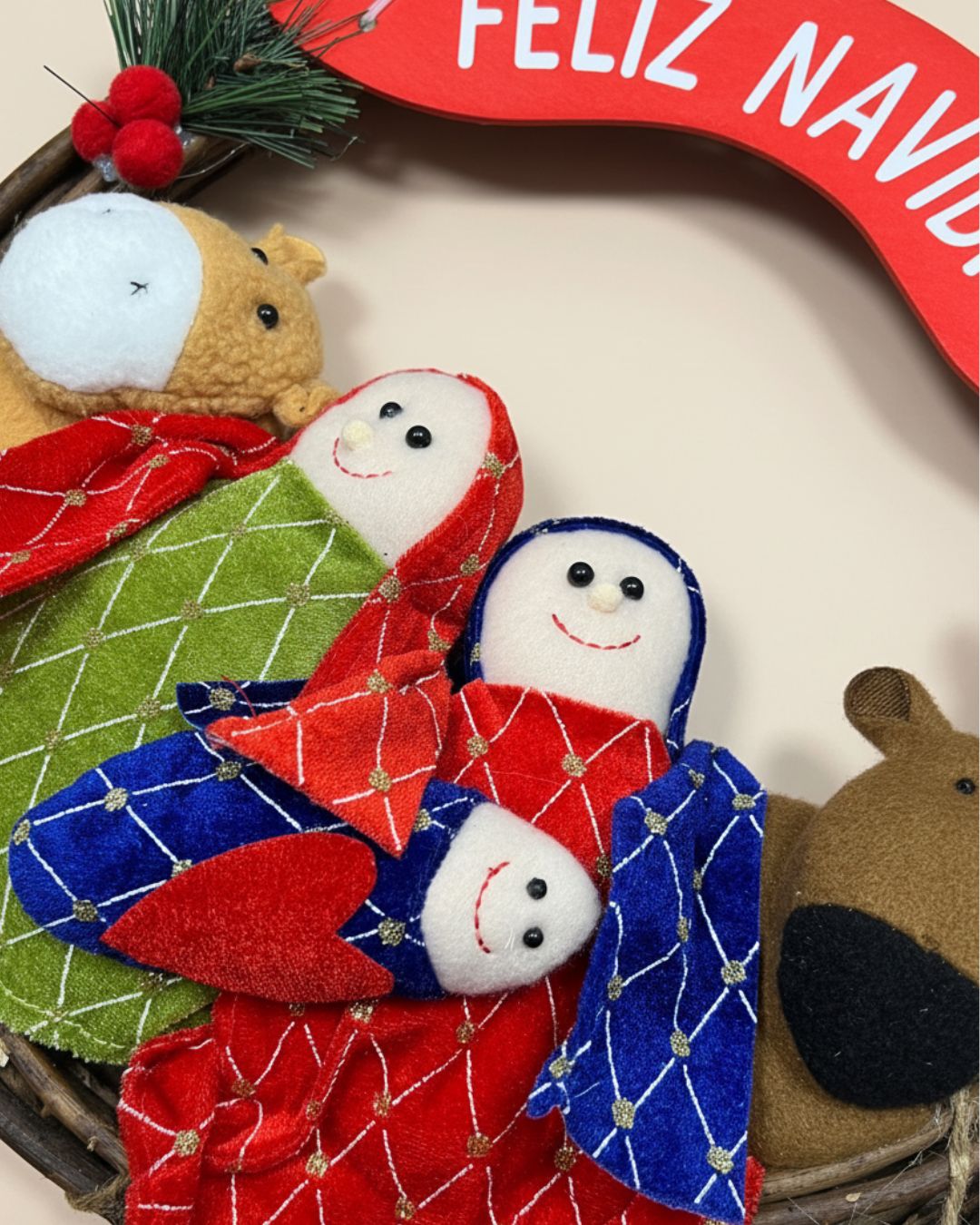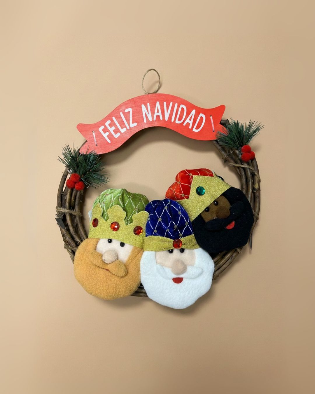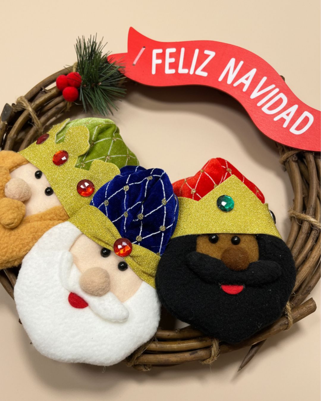 Esta corona combina tradición, color y alegría, convirtiéndose en una pieza única para celebrar tanto la Navidad como la llegada de los Reyes Magos. Su diseño artesanal y su mensaje festivo hacen que sea un adorno imprescindible para crear un ambiente navideño acogedor.