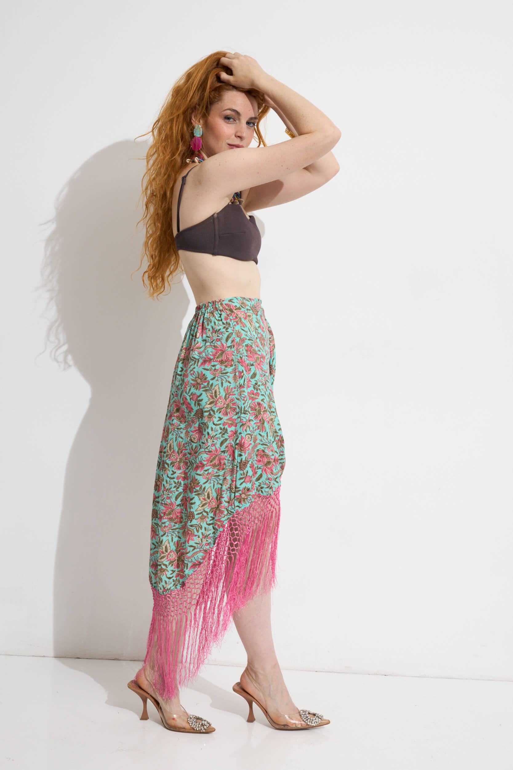 Falda Cintura Goma Asimétrica Estampada con Flecos