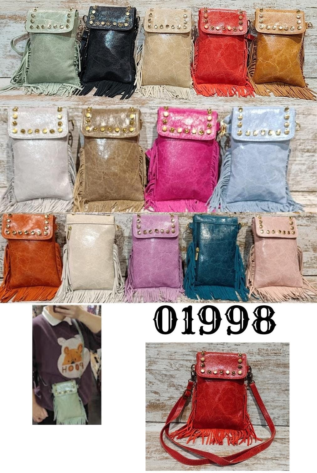 • Funda para móvil piel efecto brillo con cierre en imán en la solapa va decorada con tachuelas, interior forrado, asa larga ajustable, en la parte trasera dispone de un bolsillo con cierre en cremallera. Por los laterales va decorado con flecos.
