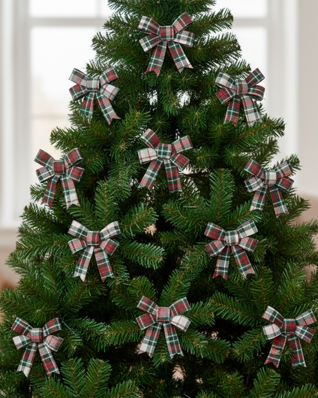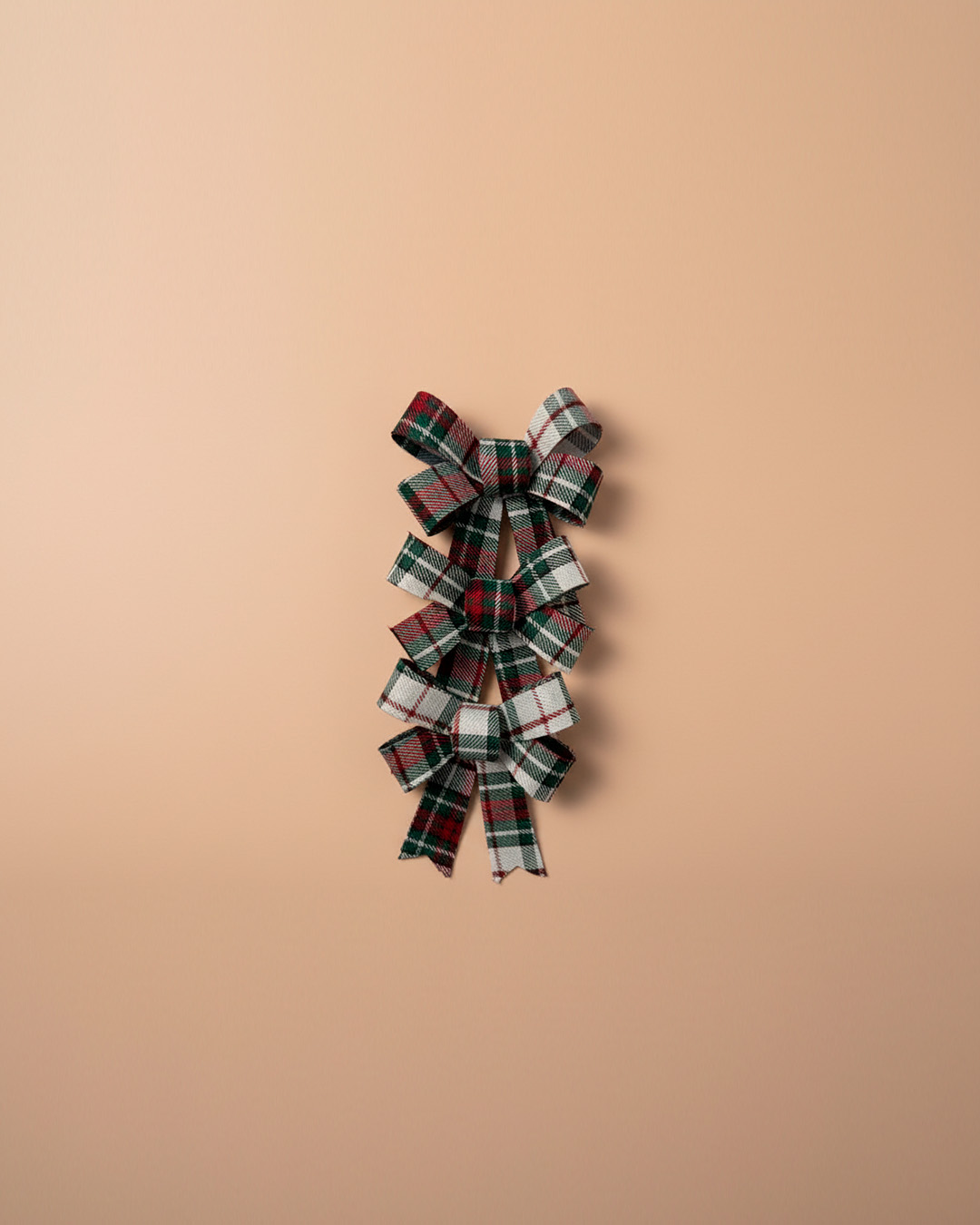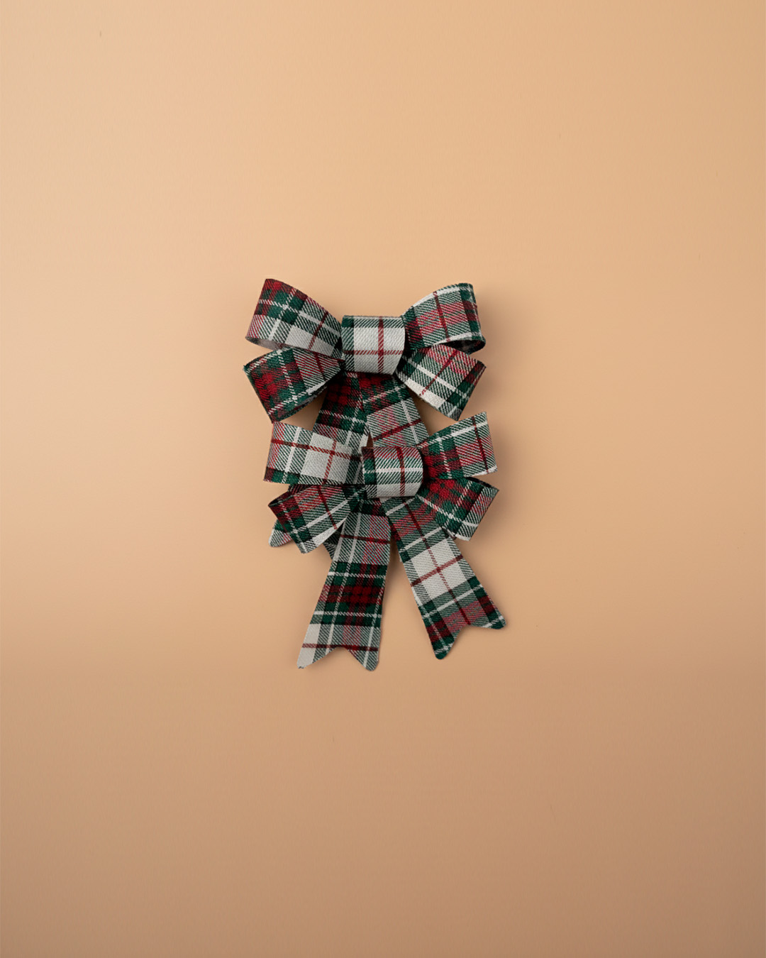Lazo navideño de tela con estampado escocés en tonos tradicionales (rojo, verde y blanco).