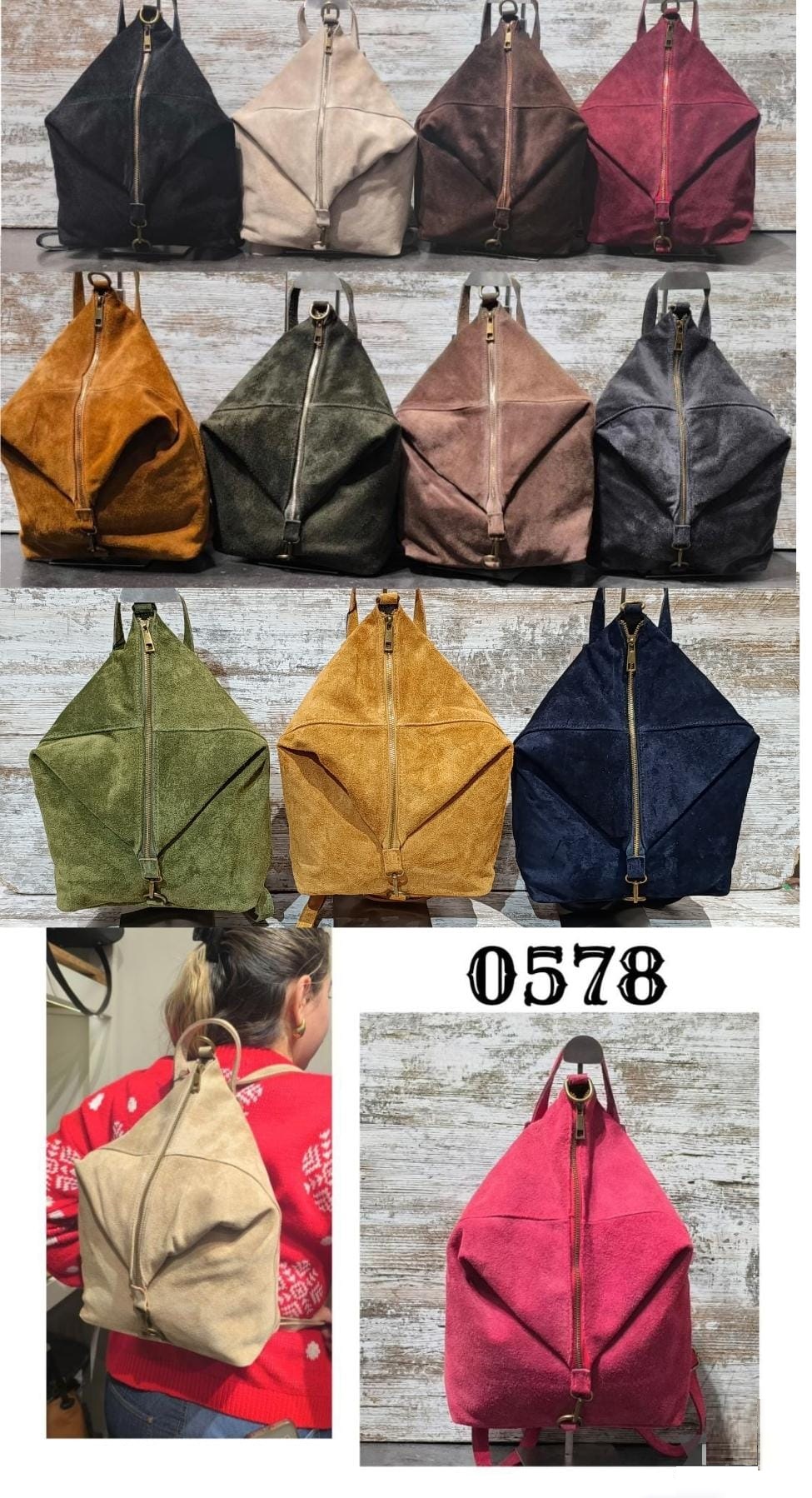 • Mochila en ante, cierra en cremallera, interior forrado, tiene dos asas ajustables.