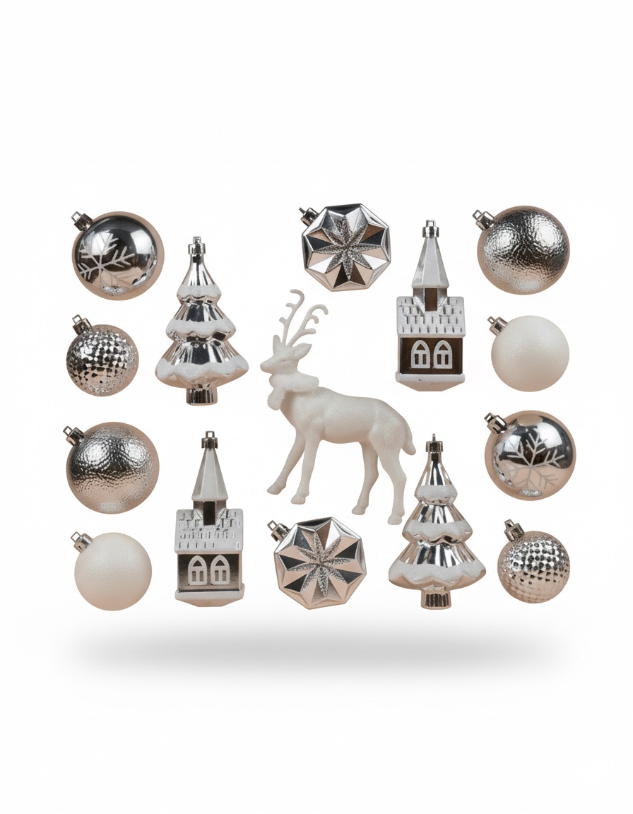 Pack de 15 adornos navideños en tonos blanco y plata, ideales para árboles y composiciones decorativas elegantes.