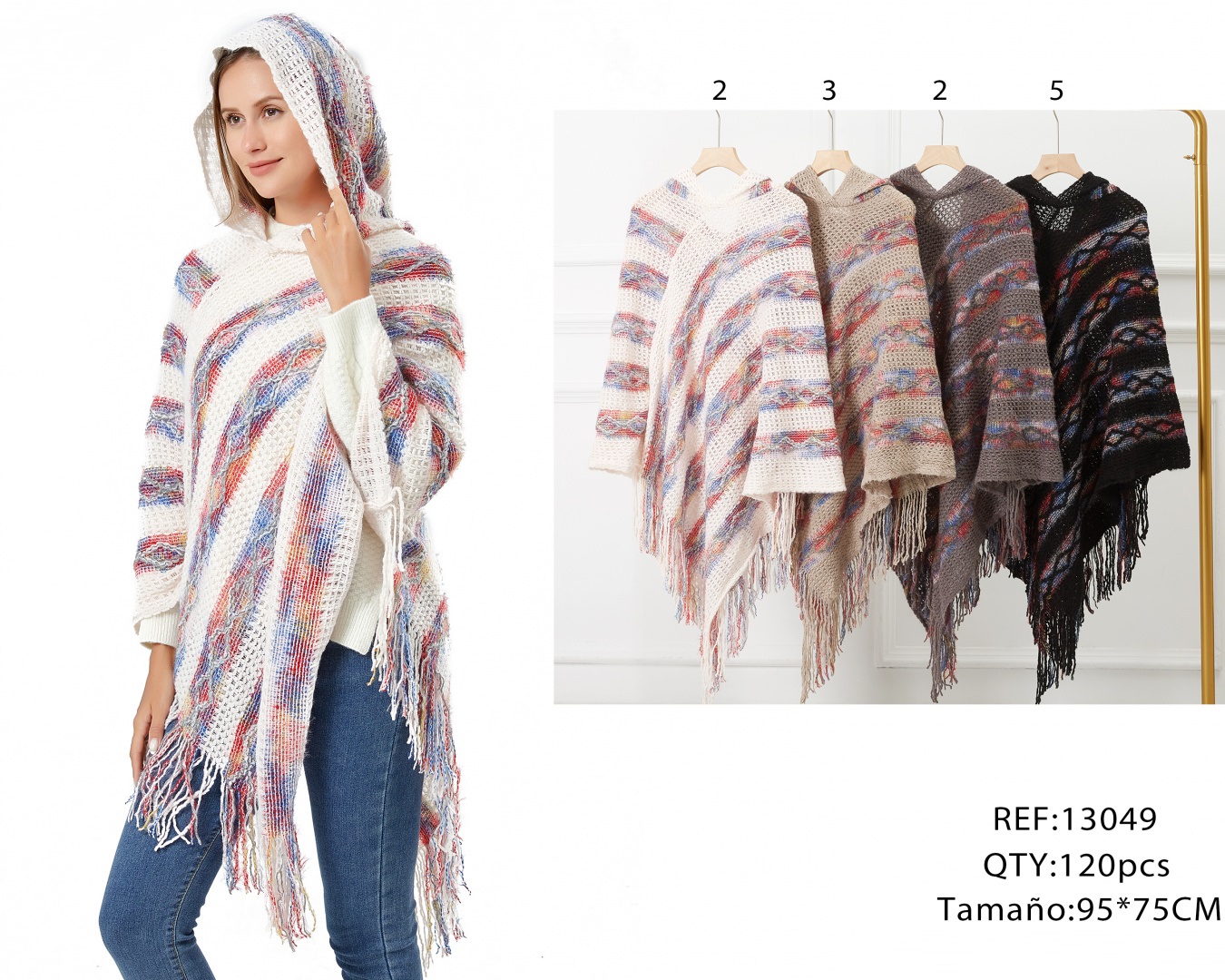 Poncho Abierto con Capucha y Cenefa Estampada Detalle Flecos
