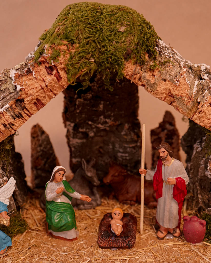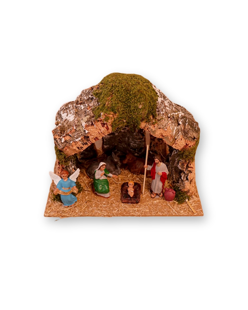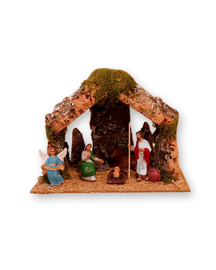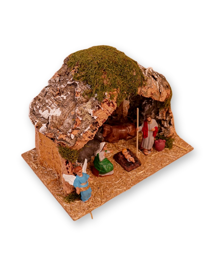 • Portal de Belén con decoración de corcho, con base rectangular y detalles de césped y  un jarrón en el lateral izquierdo.