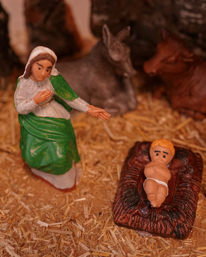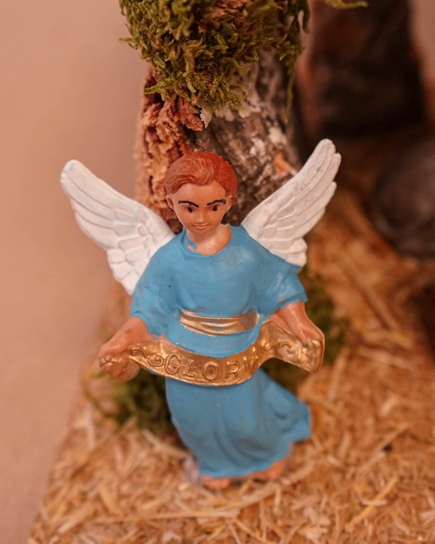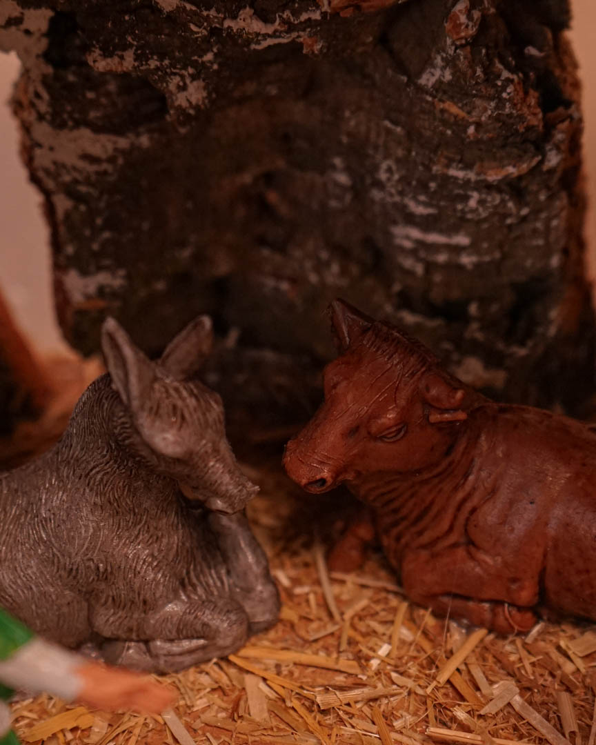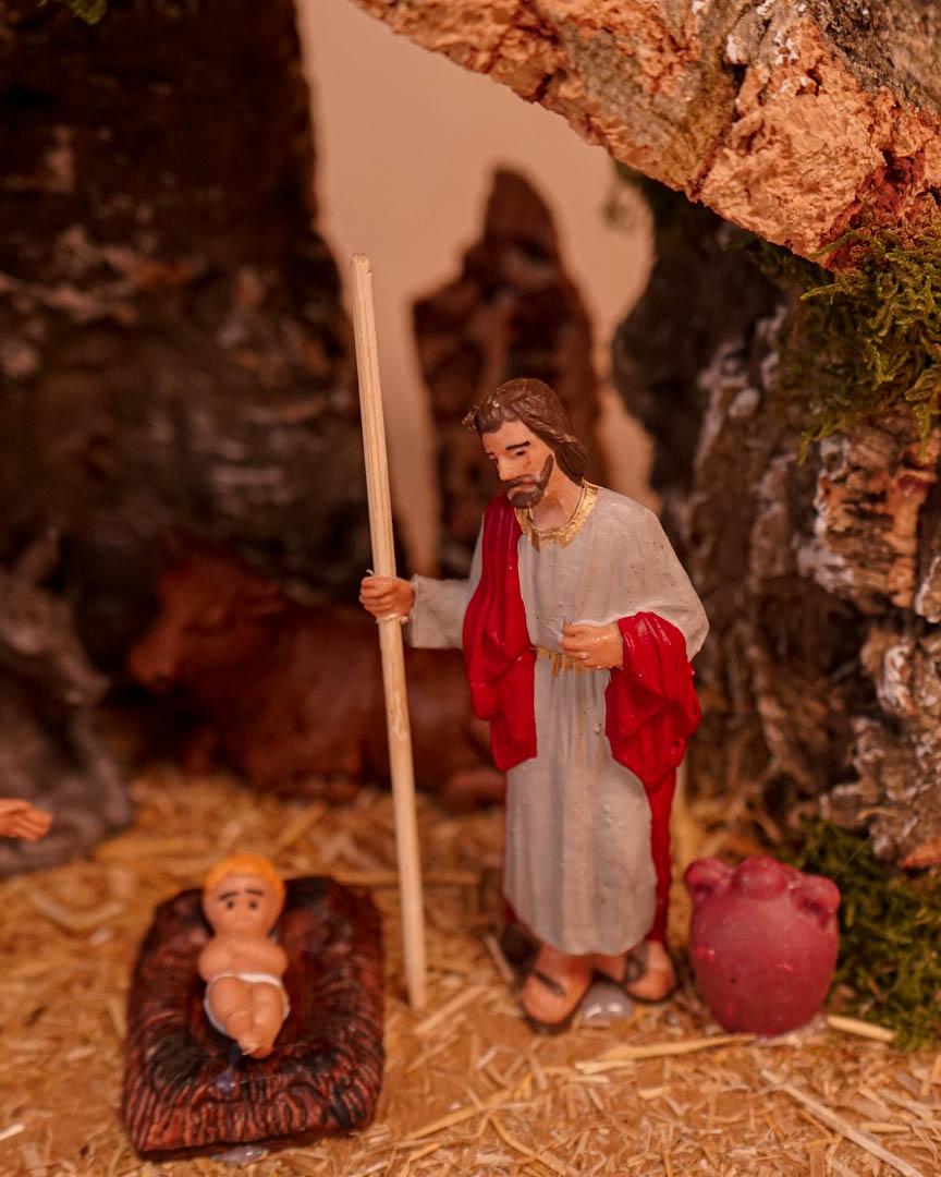 • Portal de Belén con decoración de corcho, con base rectangular y detalles de césped y  un jarrón en el lateral izquierdo.