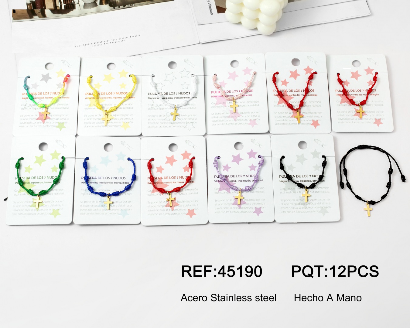 Pulsera Cuerda 7 Nudos Charm Cruz Dorado