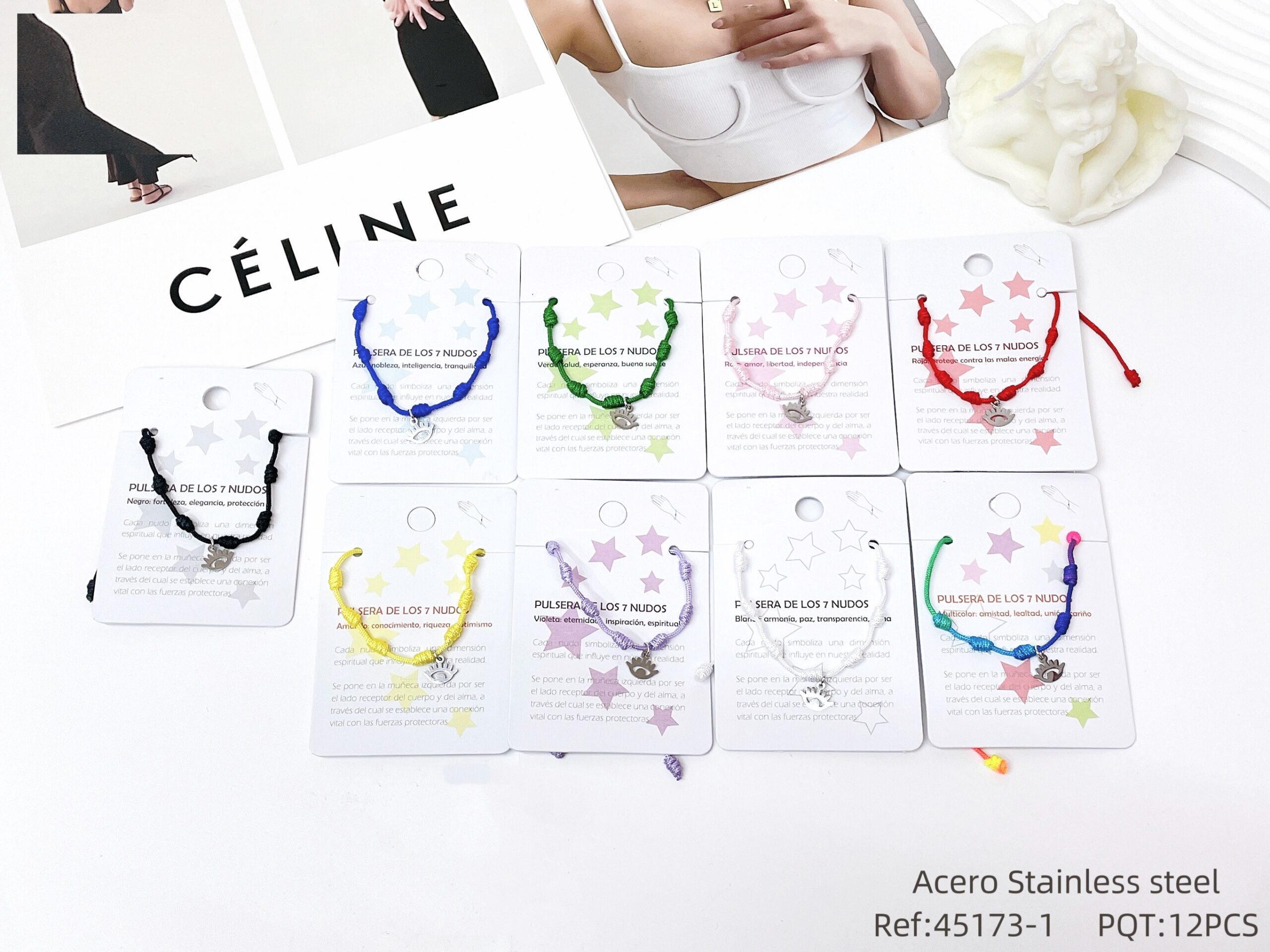 Pulsera Cuerda 7 Nudos Charm Ojo Turco Plata
