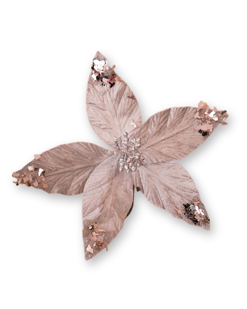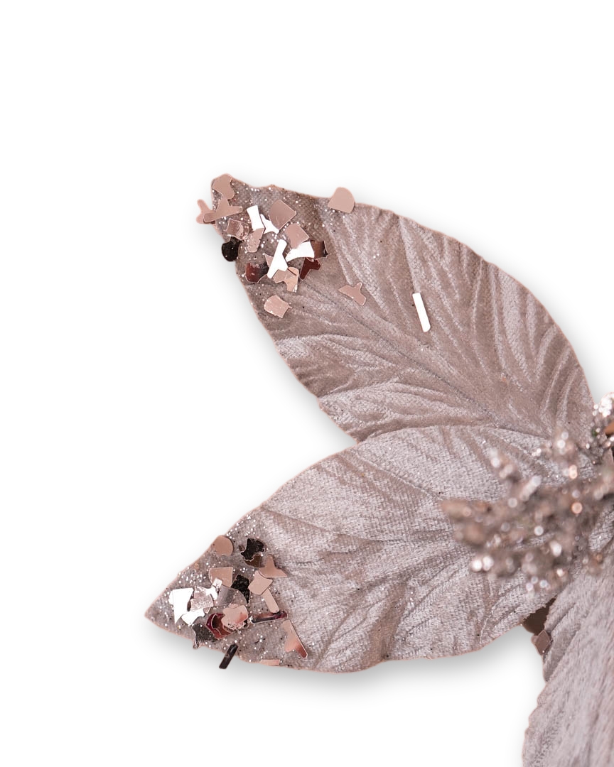 • Una pieza de flor plateada artificial para decorar tu árbol de navidad con hojas en terciopelo y otras con brillantes.