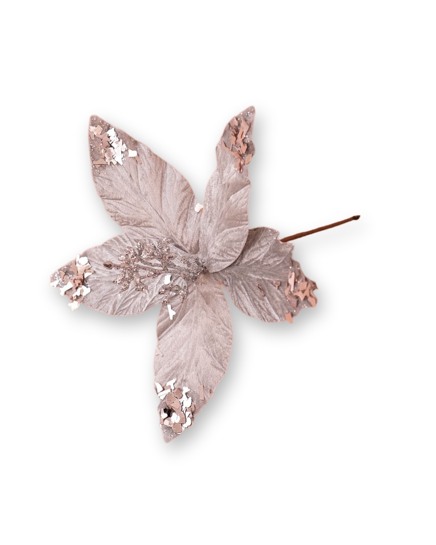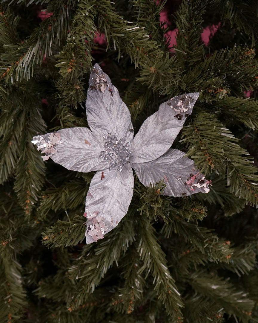 Una Pieza Flor Artificial Navideña Plateada con Hojas Aterciopeladas y Brillantes