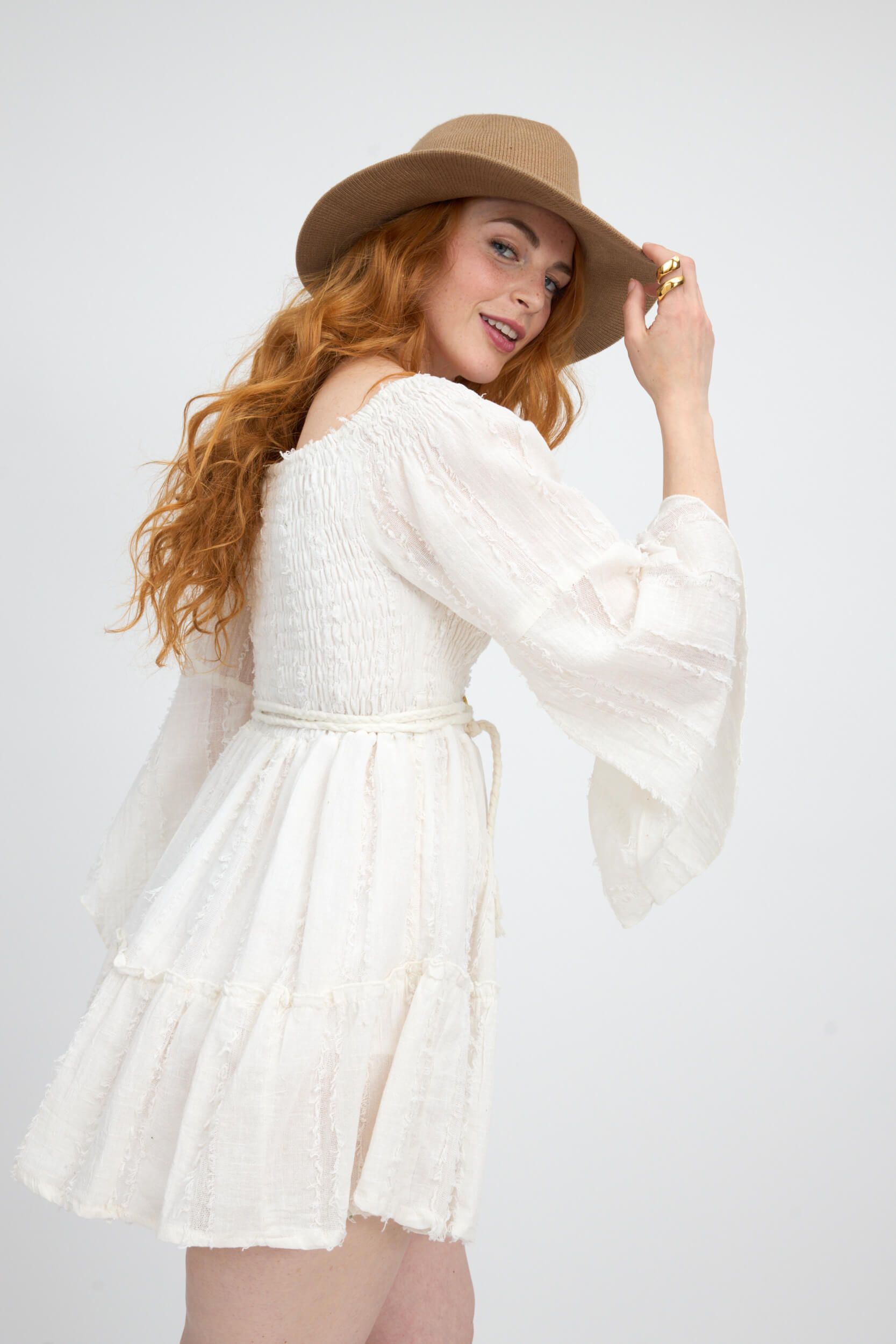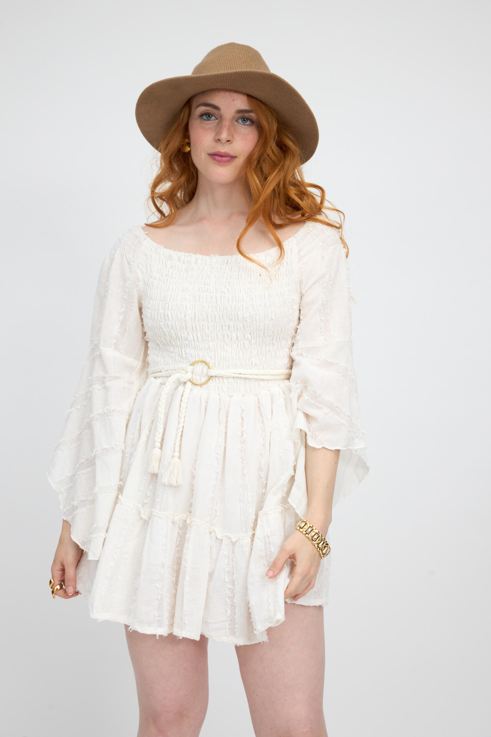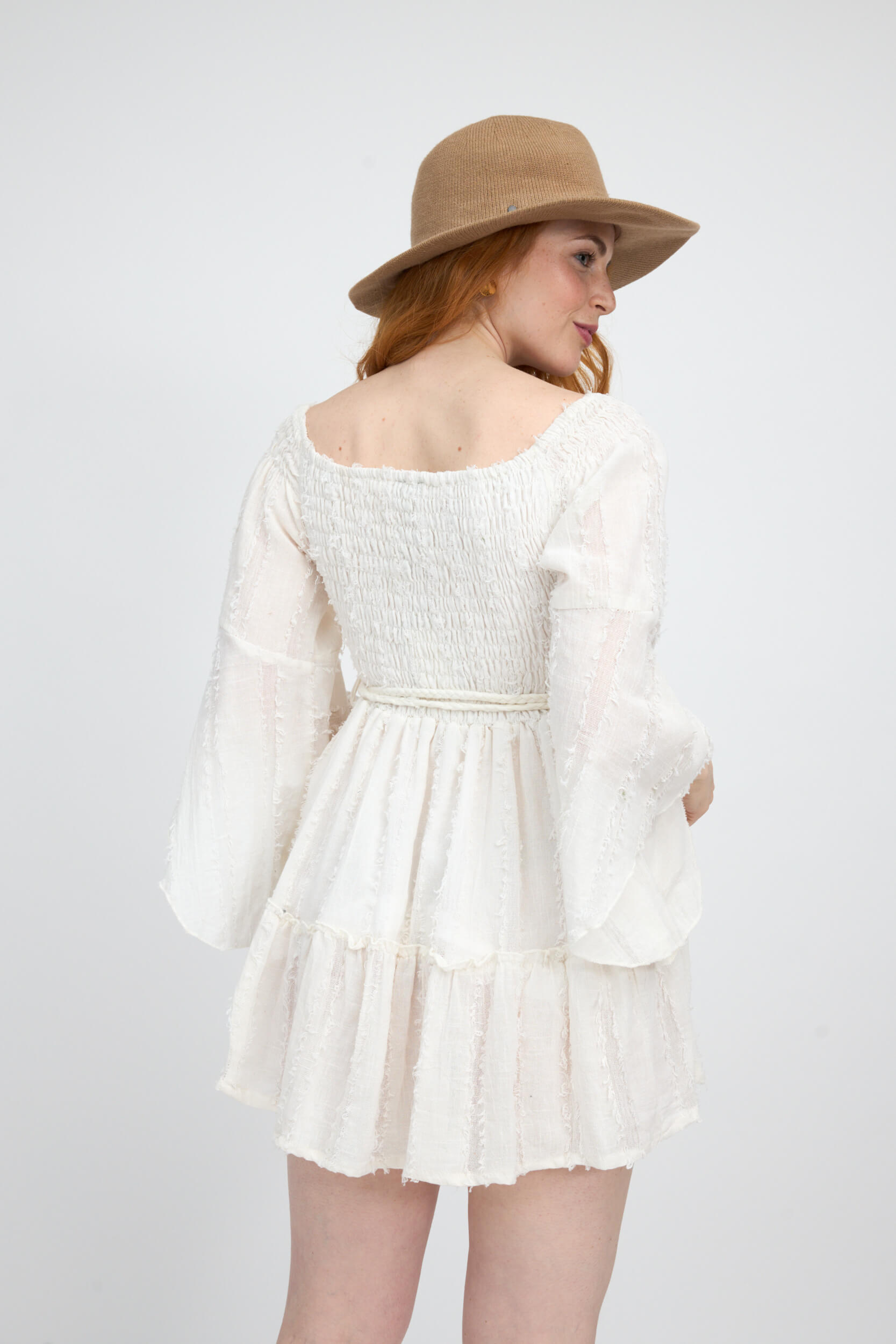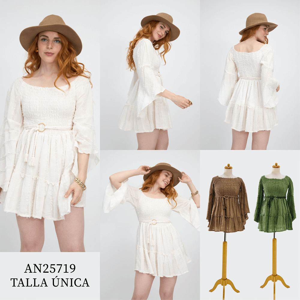 Vestido Corto Liso Offshoulder Tejido Diseño Deshilachado